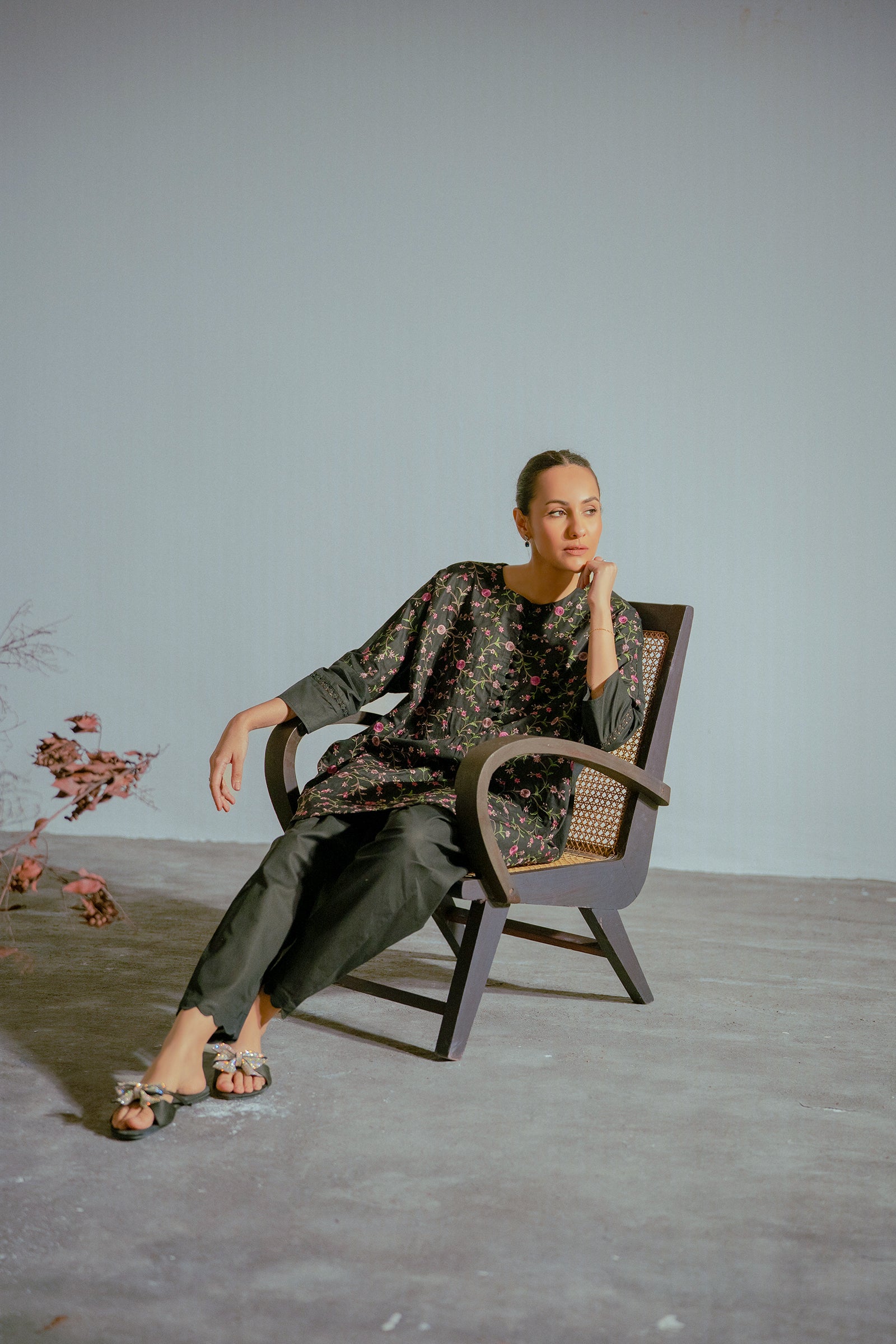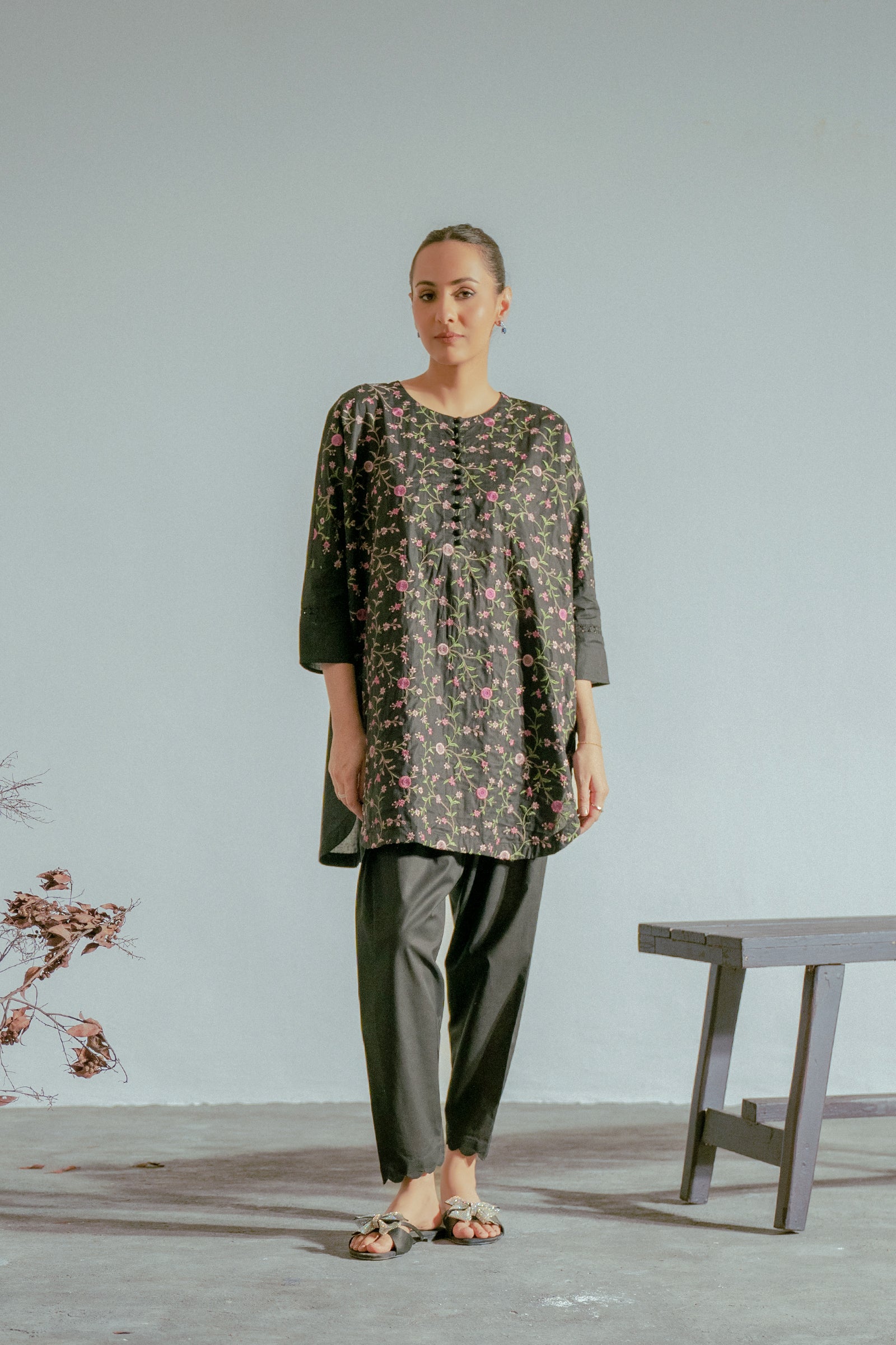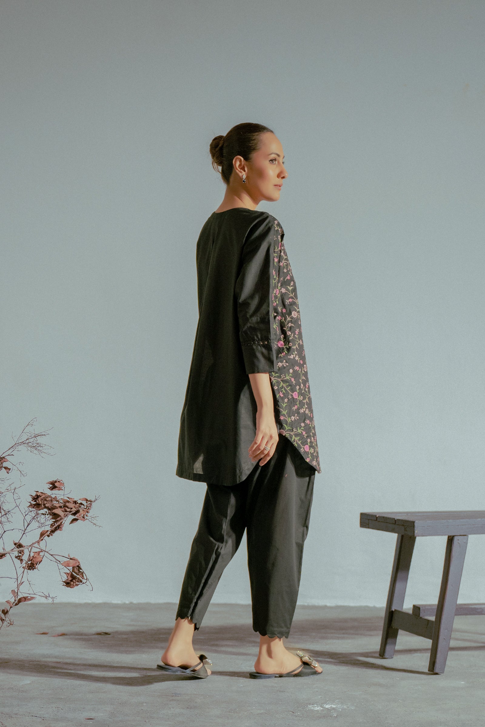 Elevate your wardrobe with this black embroidered kurta, perfectly complemented by a sleek shalwar for a refined and graceful look.