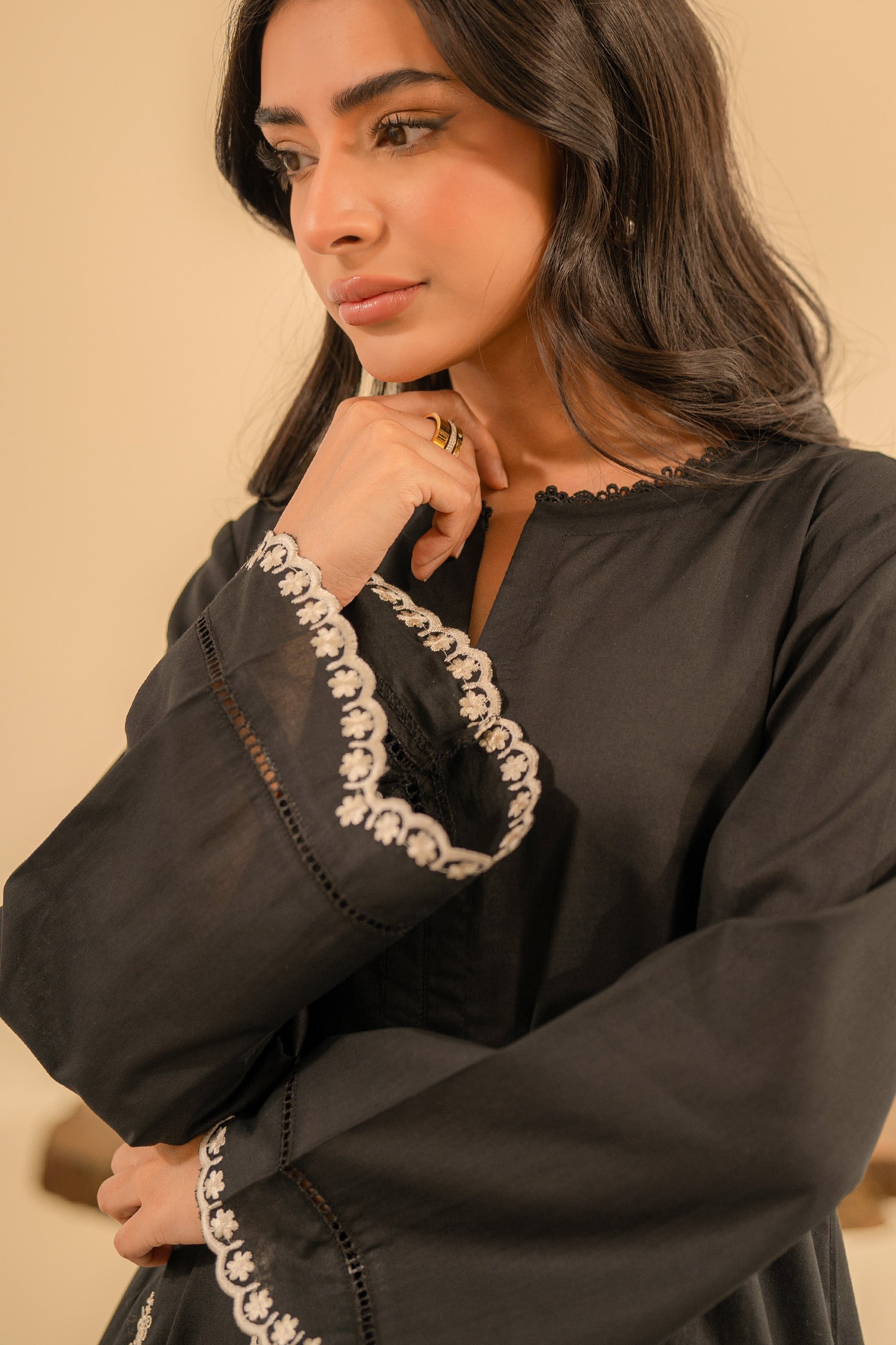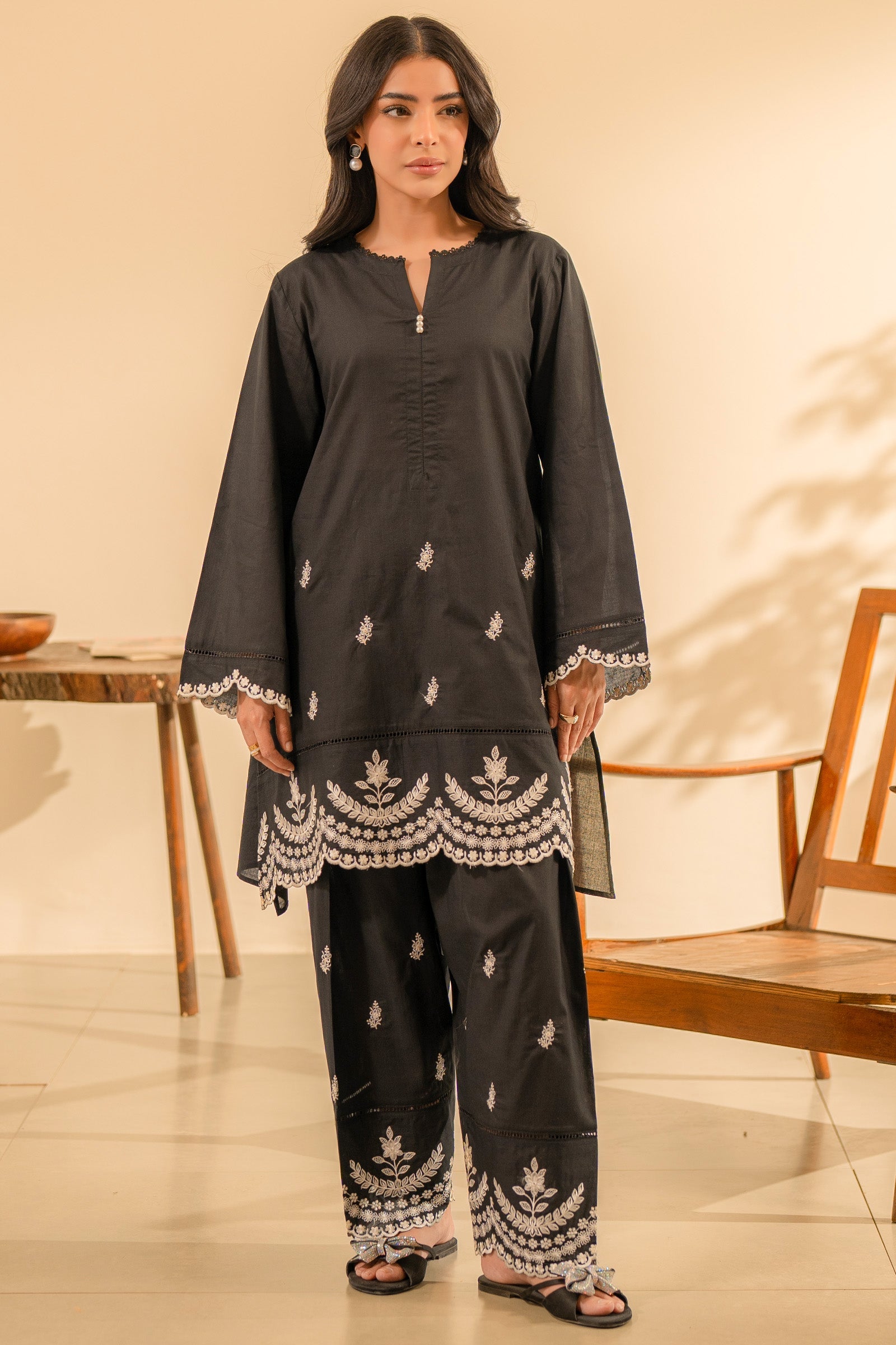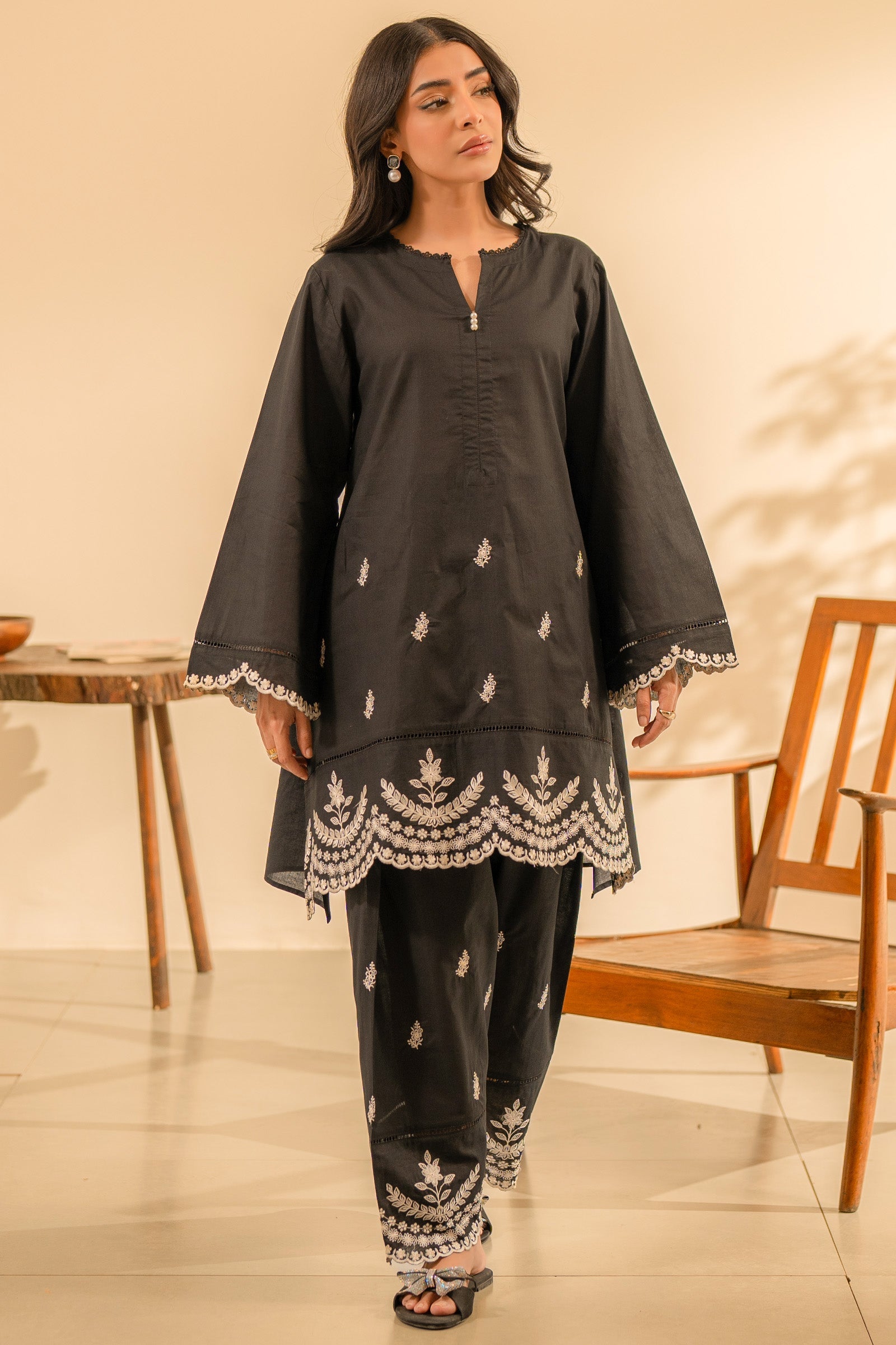 This 2-piece embroidered suit featuring a straight kurta with intricate white thread embroidery on the hem, sleeves, and trousers, paired with matching wide-leg bottoms for a chic and elegant look