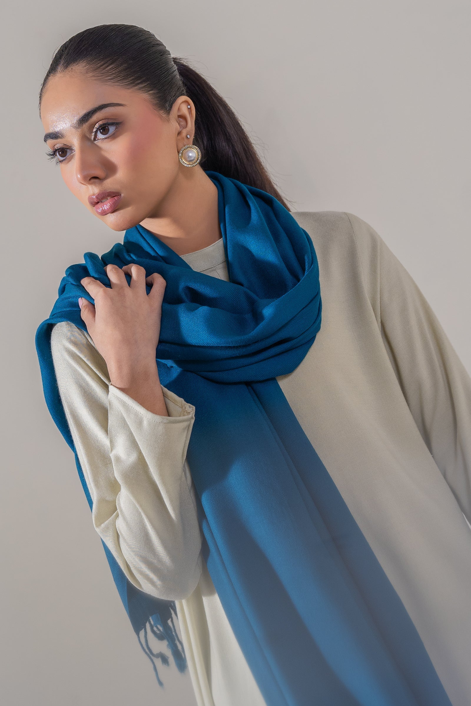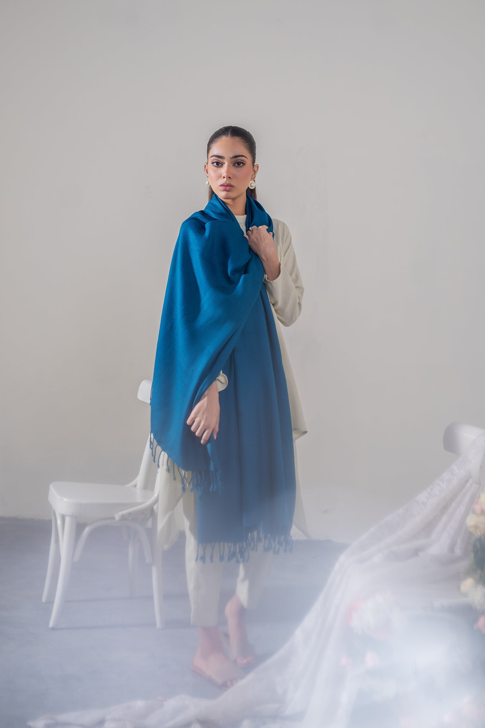 This warm teal colored solid shawl with perfect for winter, finished with delicate fringe