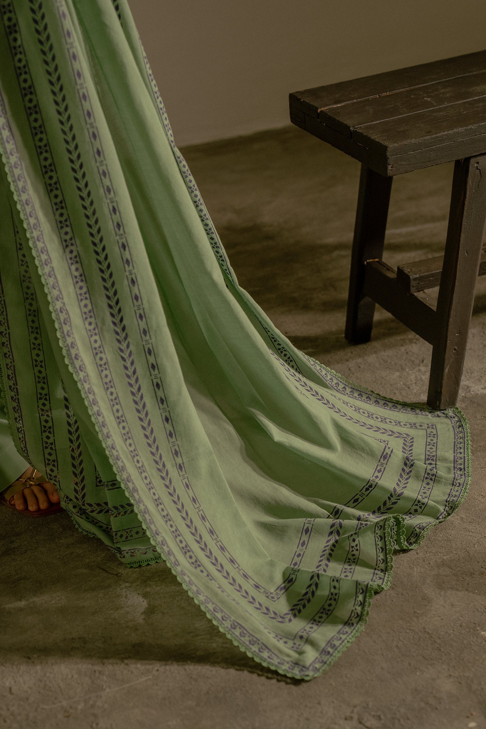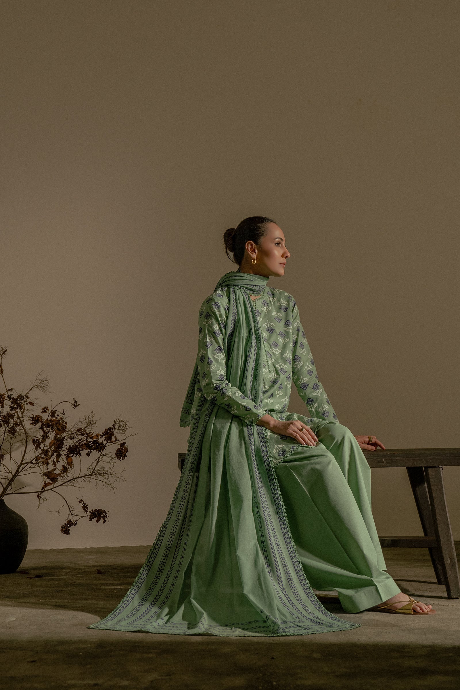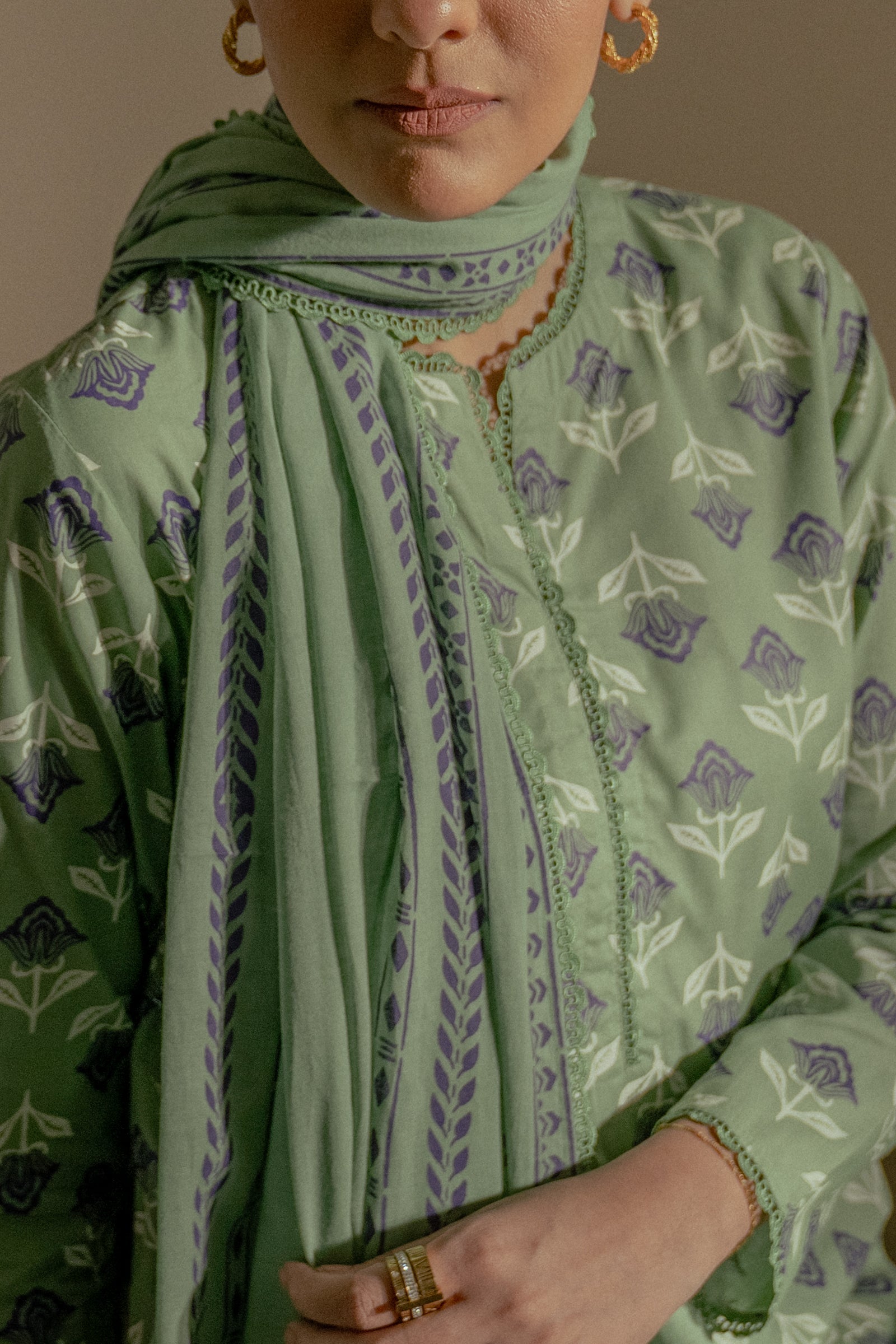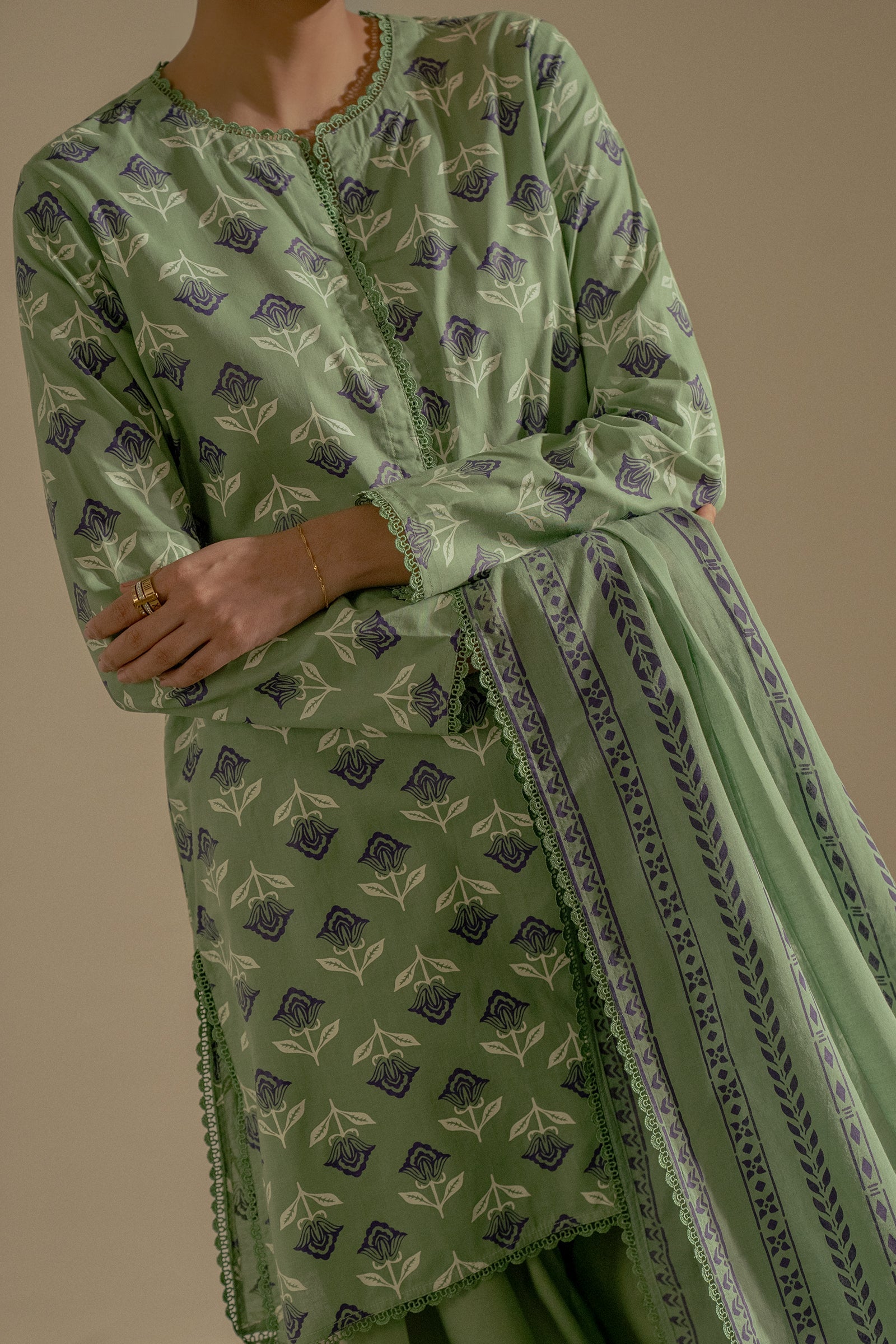 This light green kurta, dupatta with hand screen print paired with farshi shalawar is all you need for an elegant everyday look