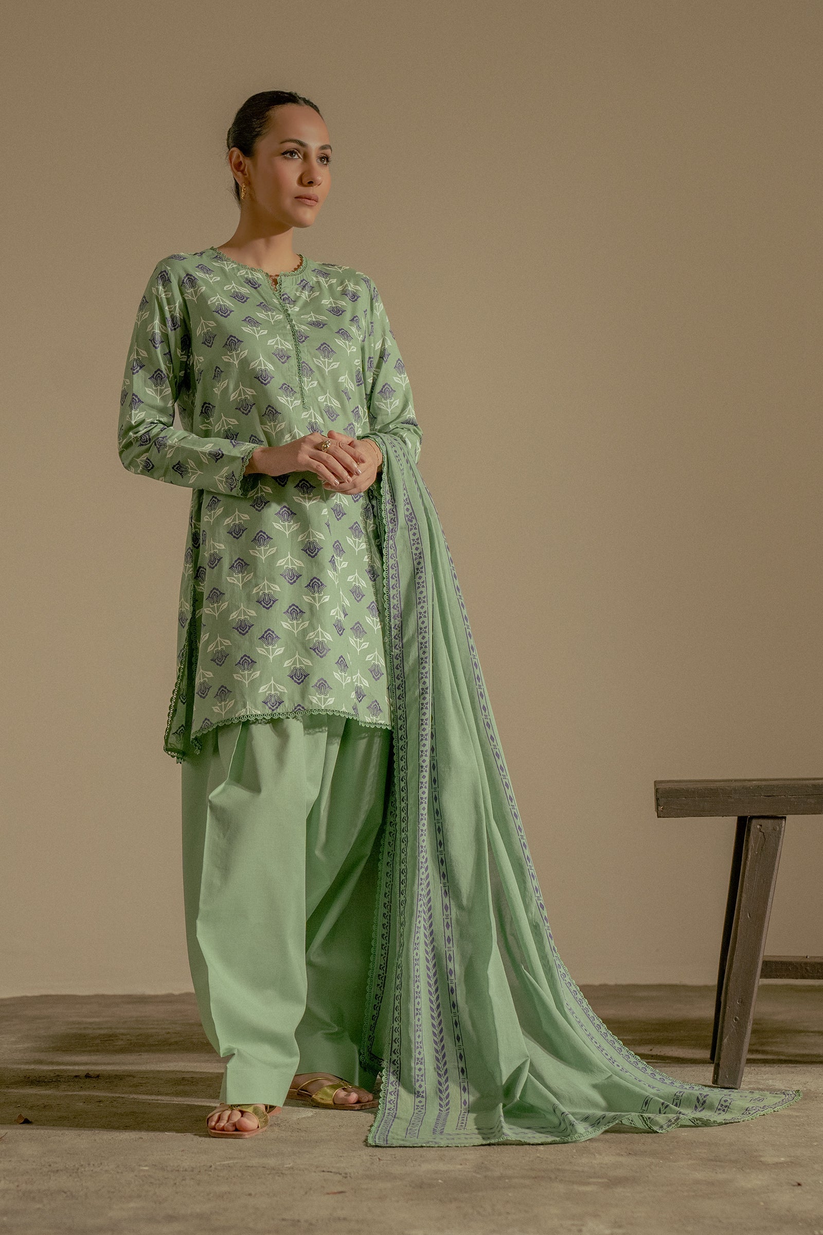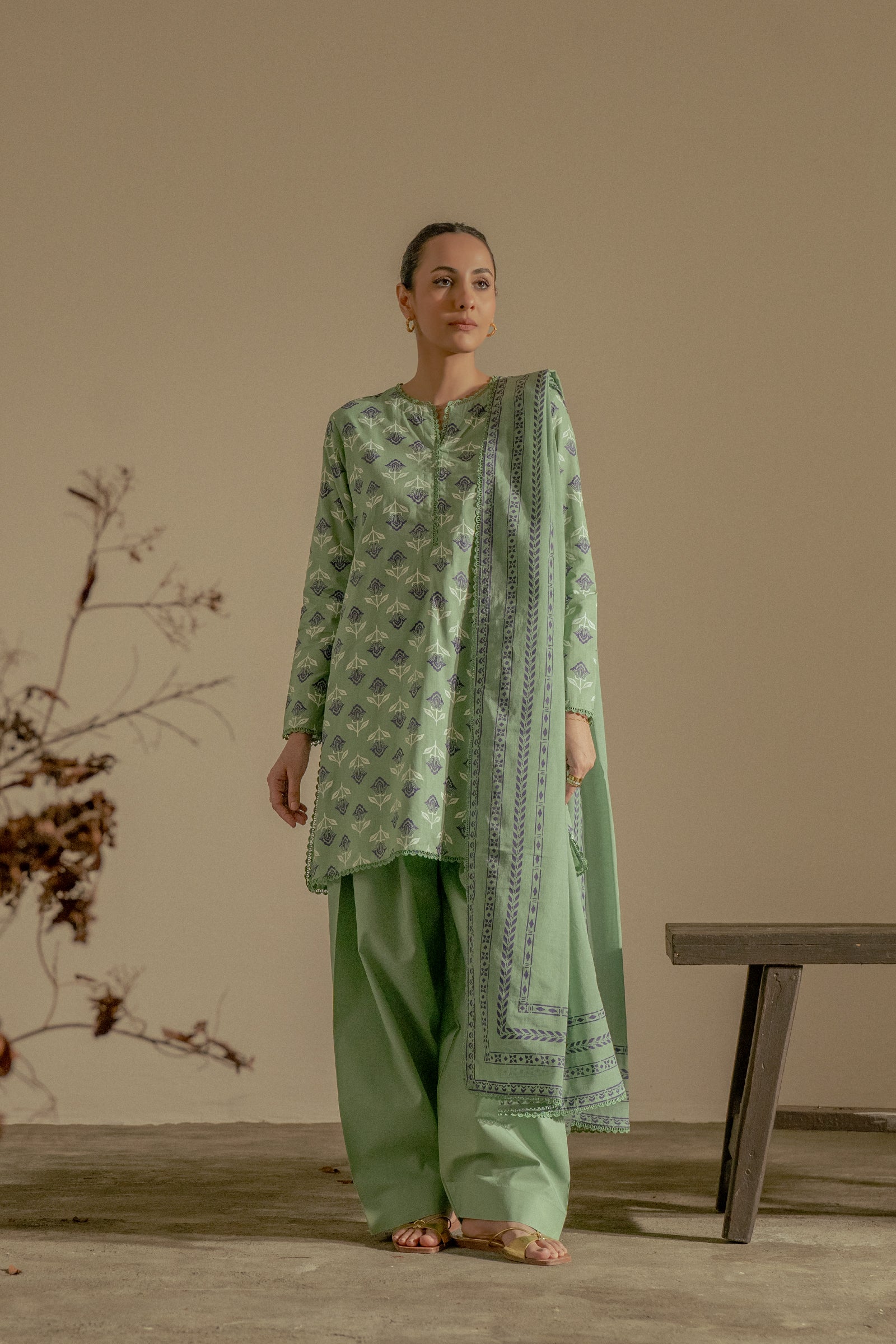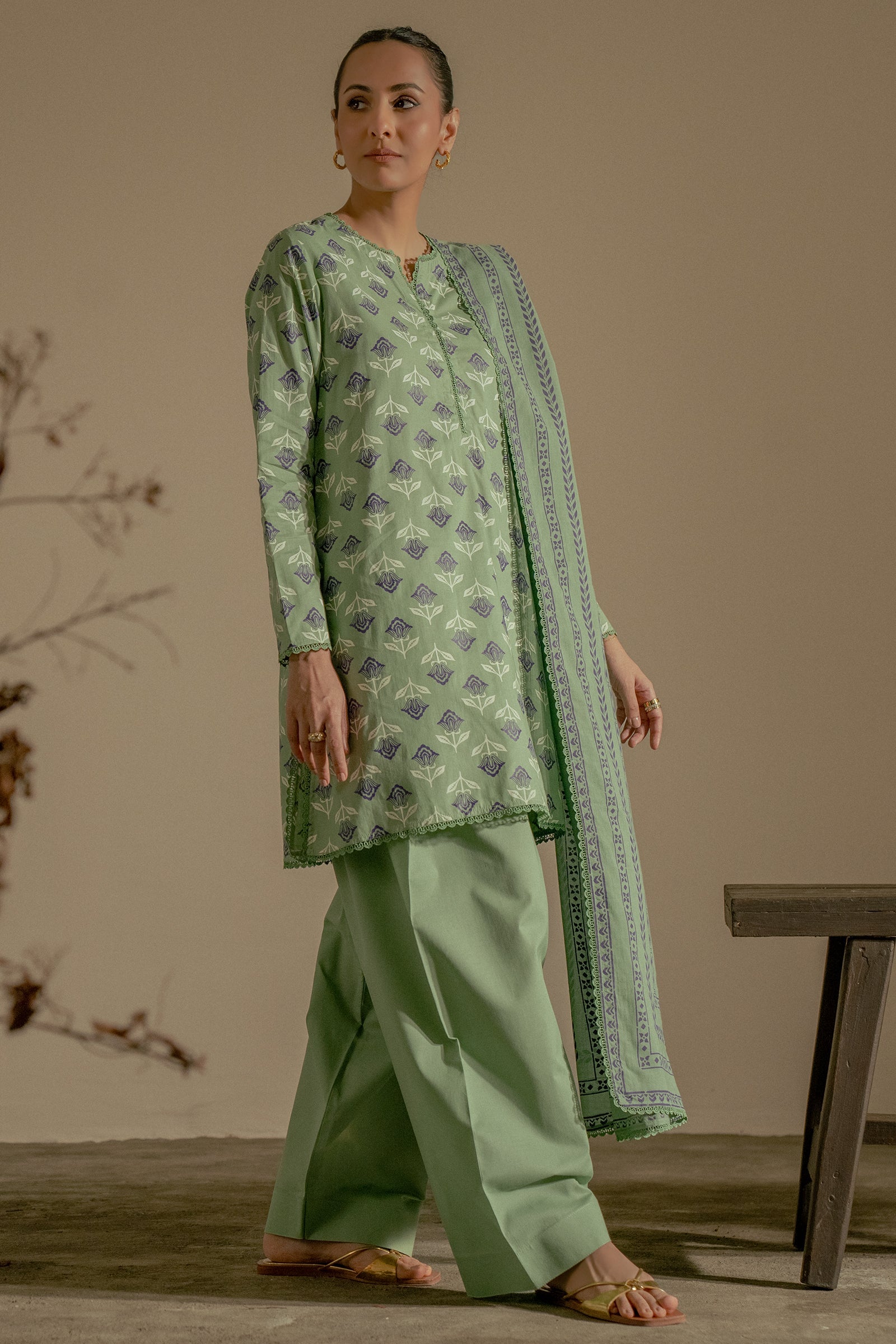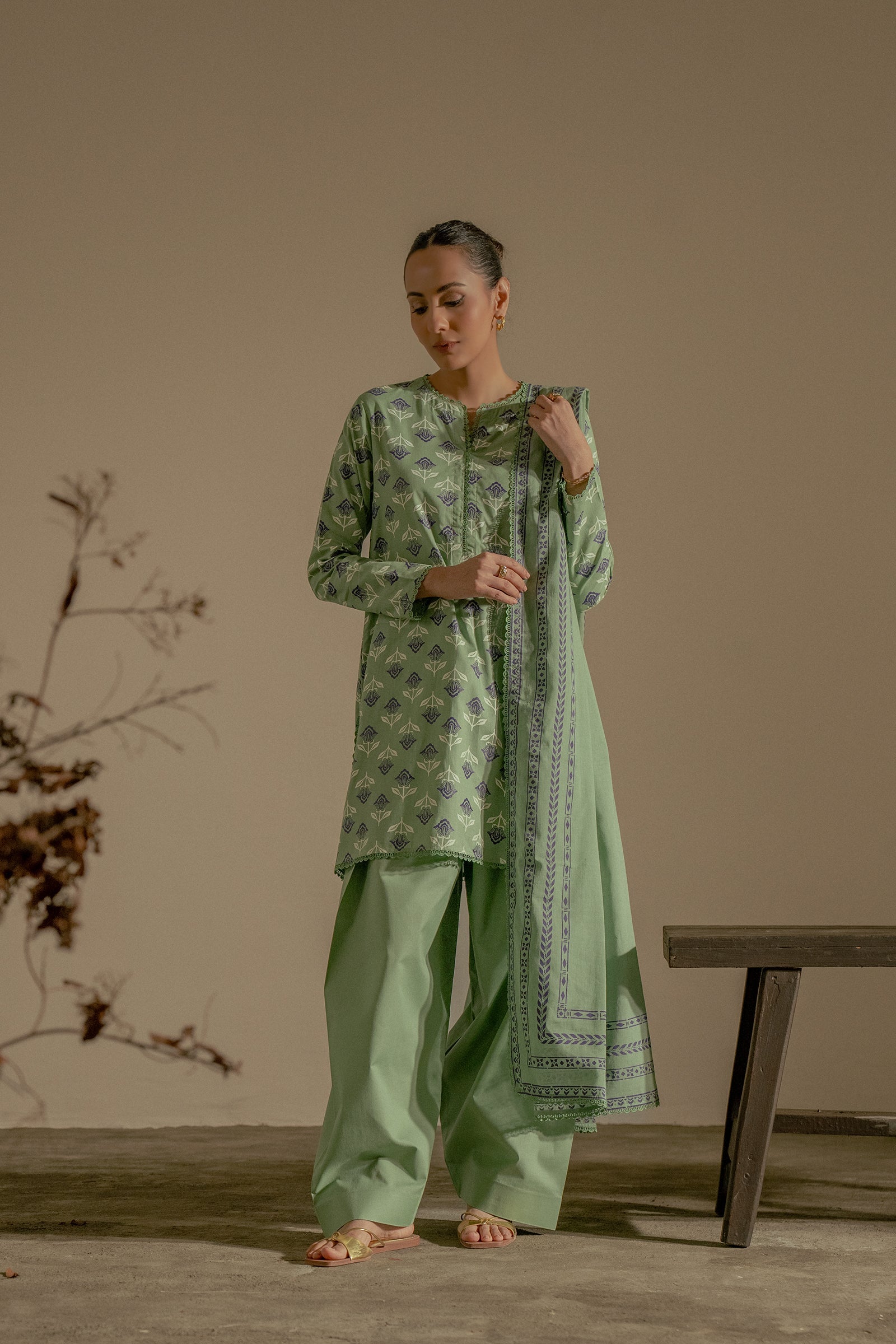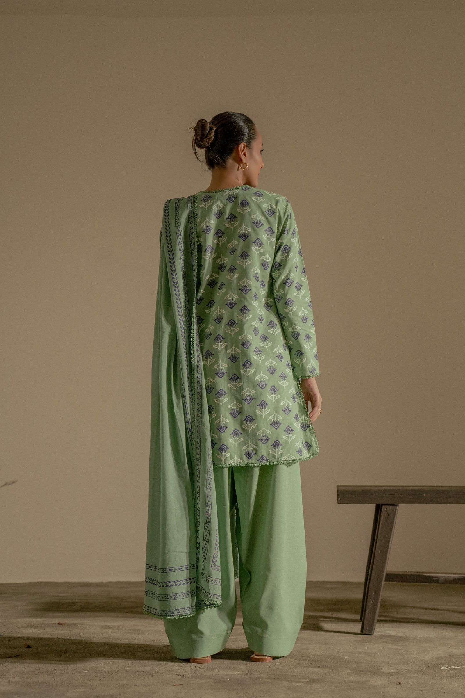 This light green kurta, dupatta with hand screen print paired with farshi shalawar is all you need for an elegant everyday look
