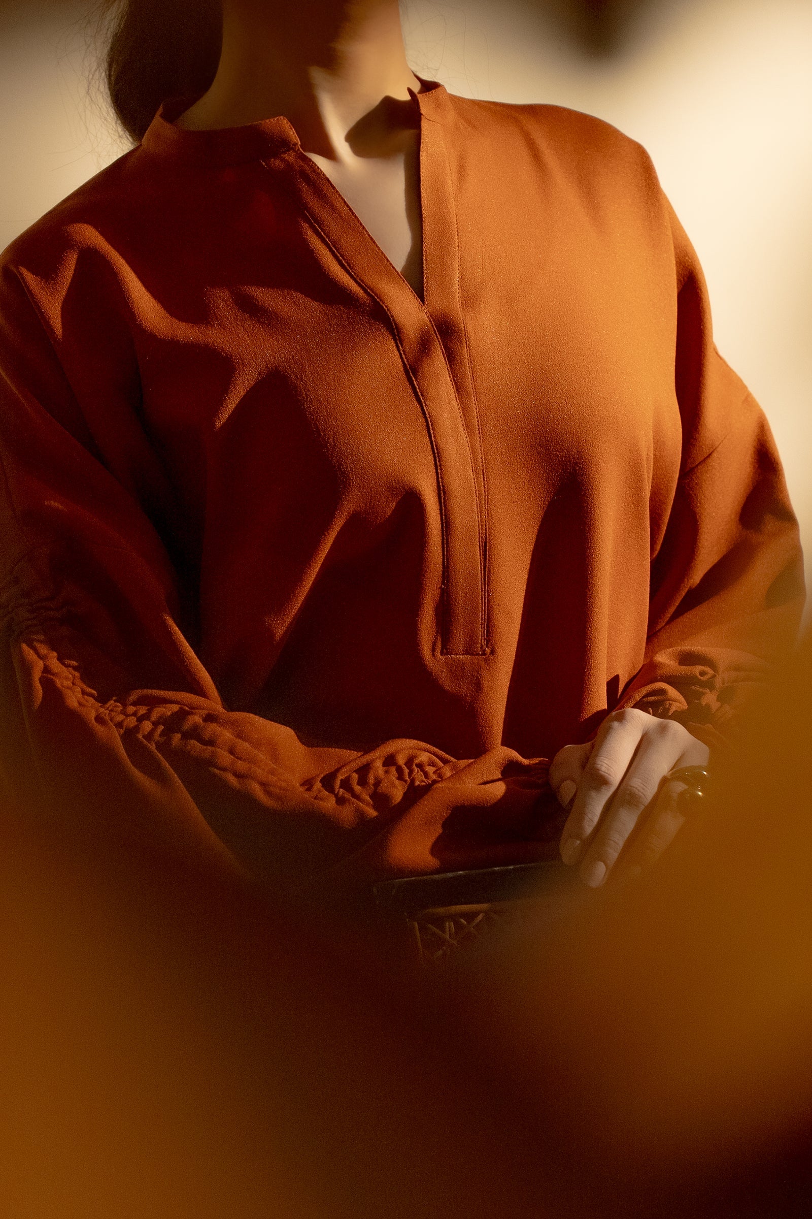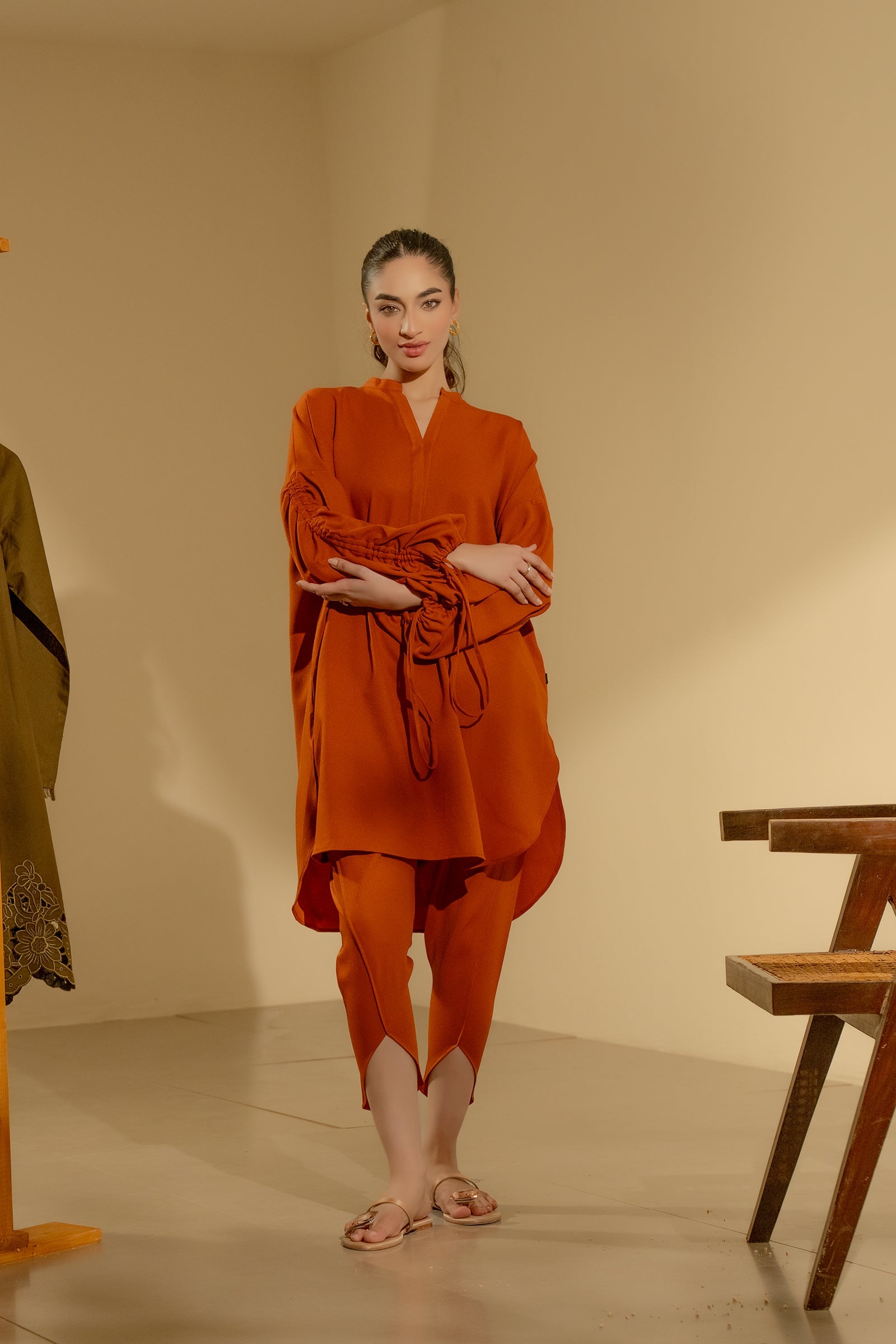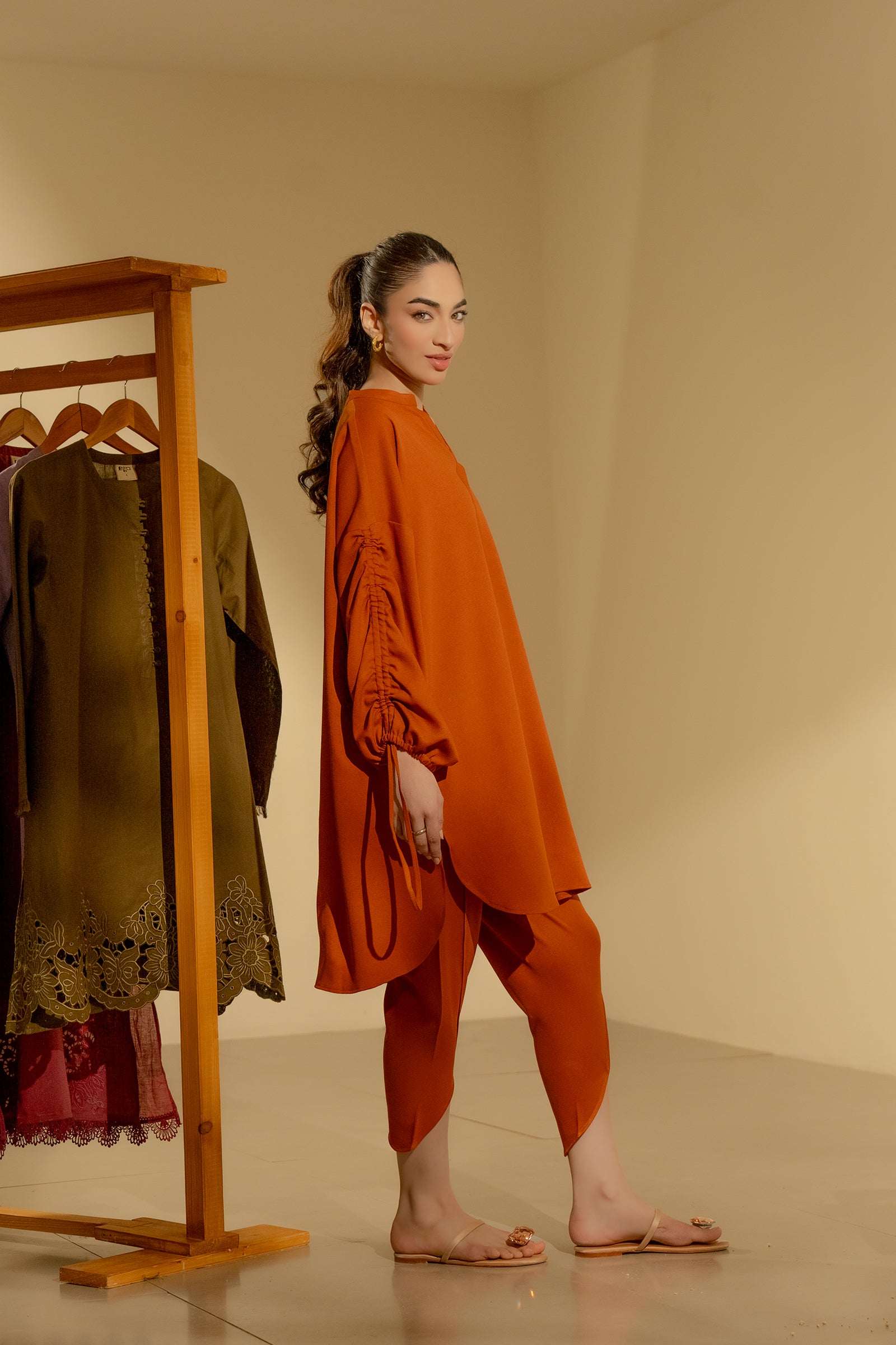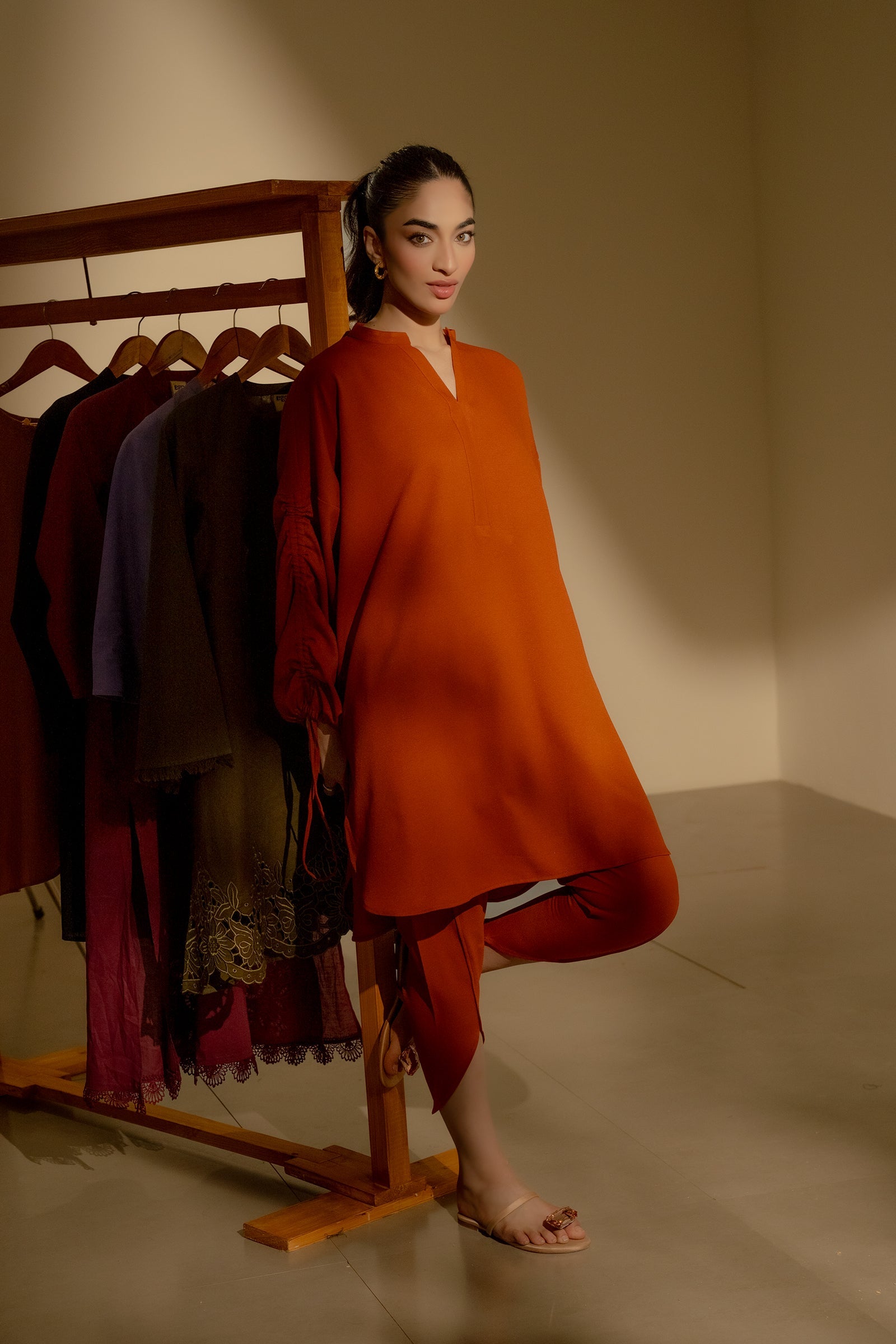 This rust colored loose cut kurta paired with tulip is smart yet comfy. Perfect for this season.