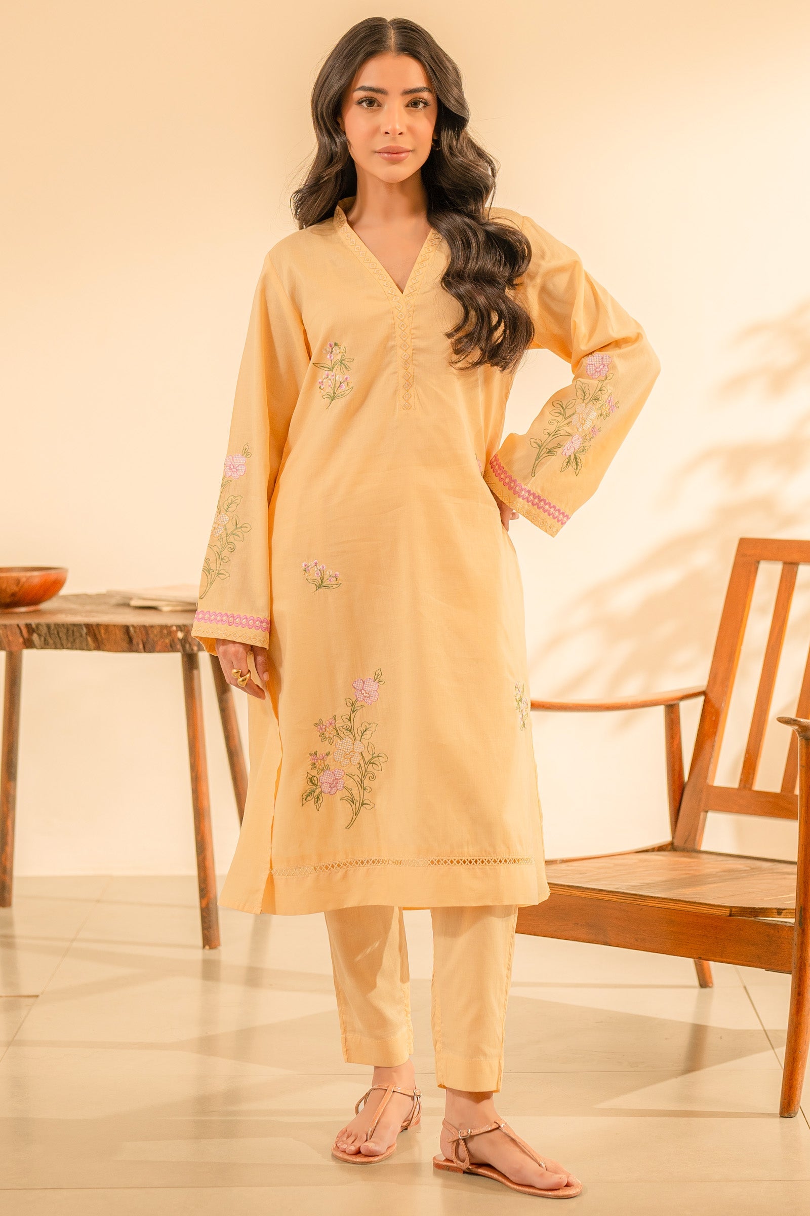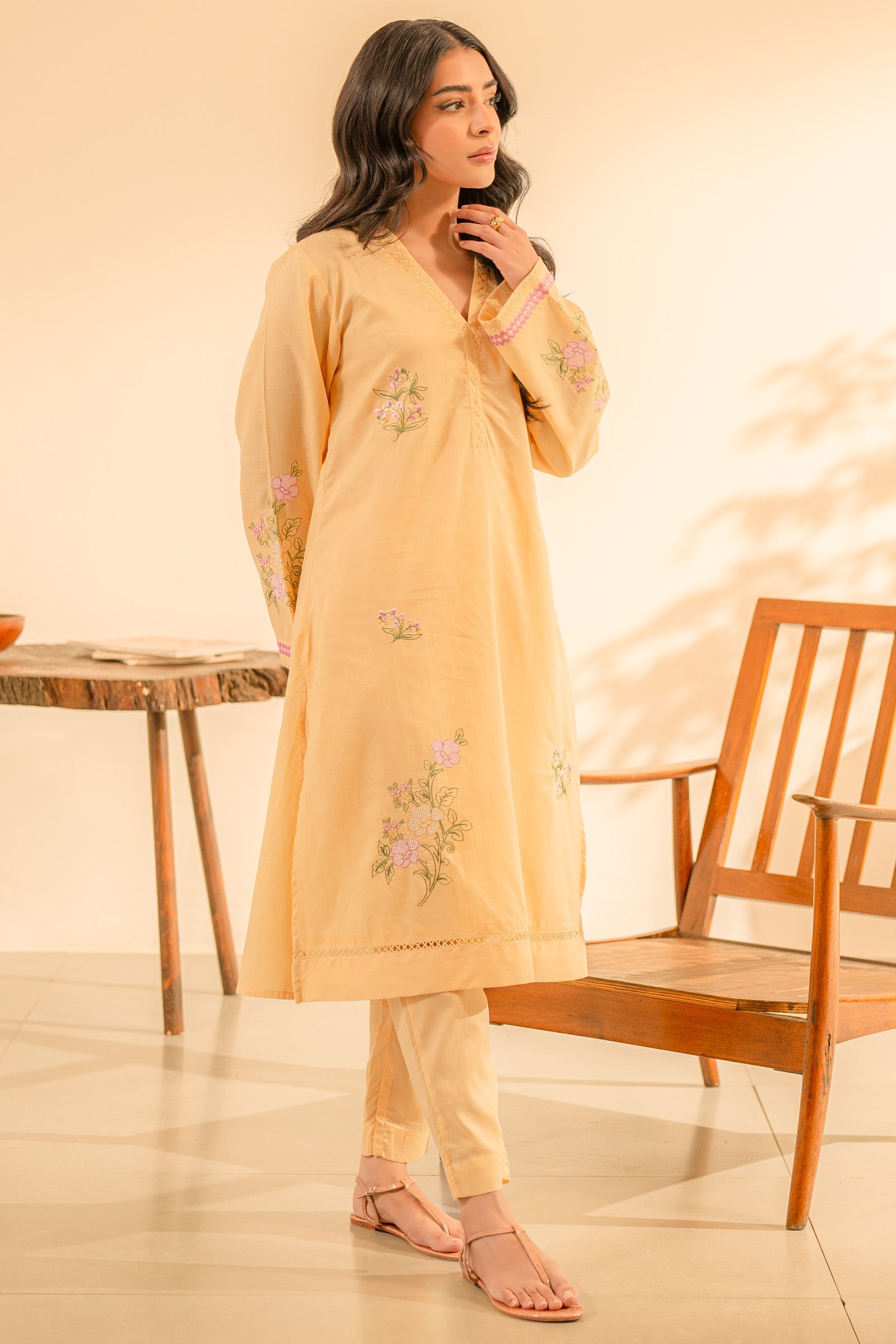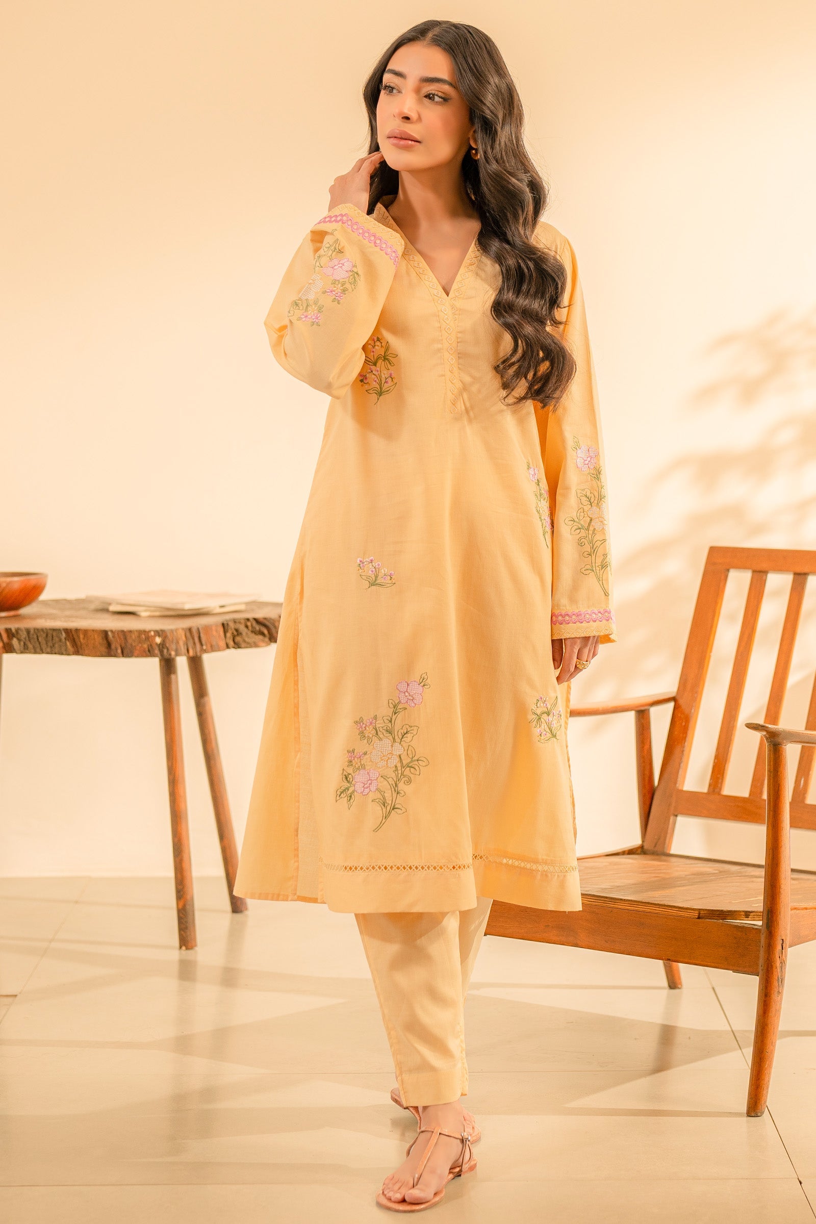 Embrace elegance with this yellow colored kurta with embroidery paired with straight pants