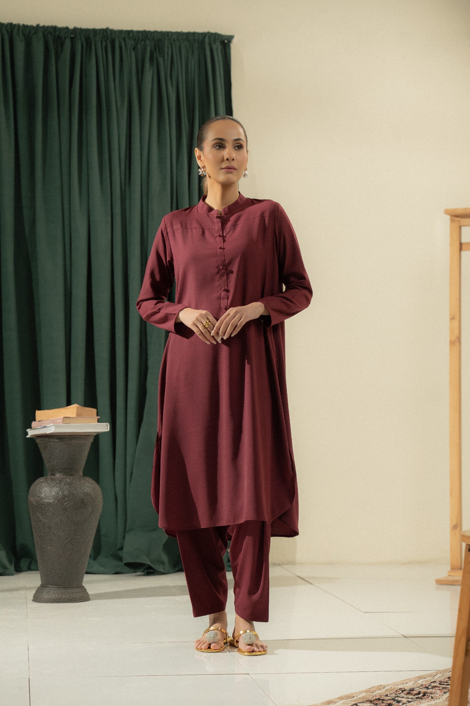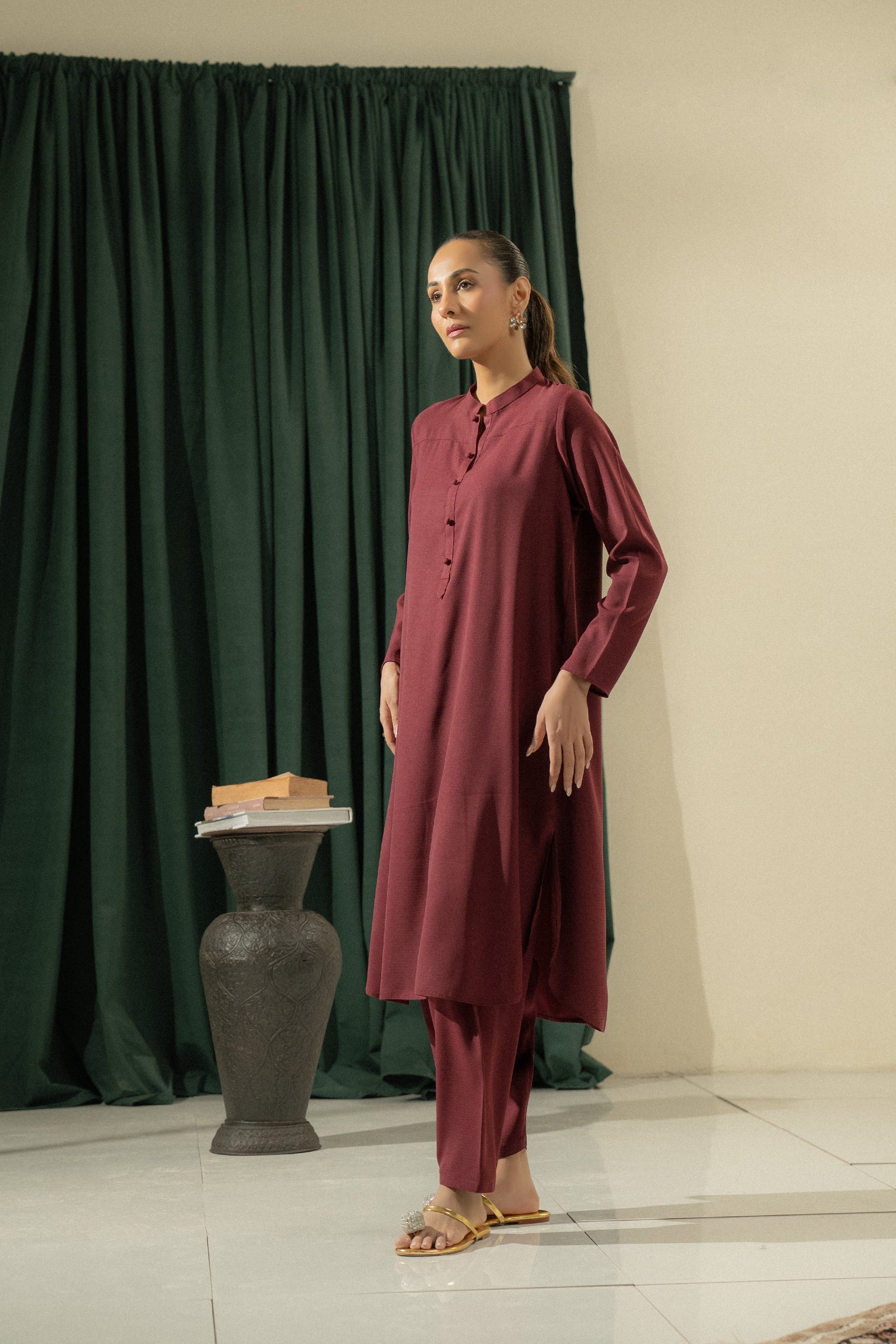This maroon solid kurta paired with shalwar is perfect for effortless elegance and comfortable wear.