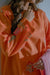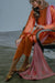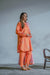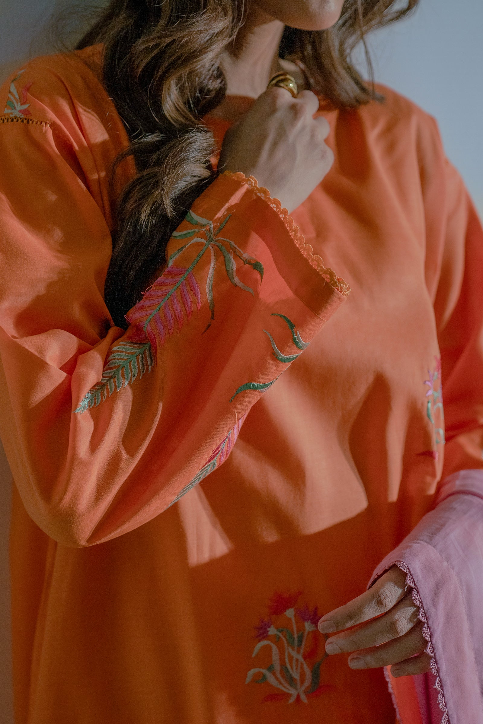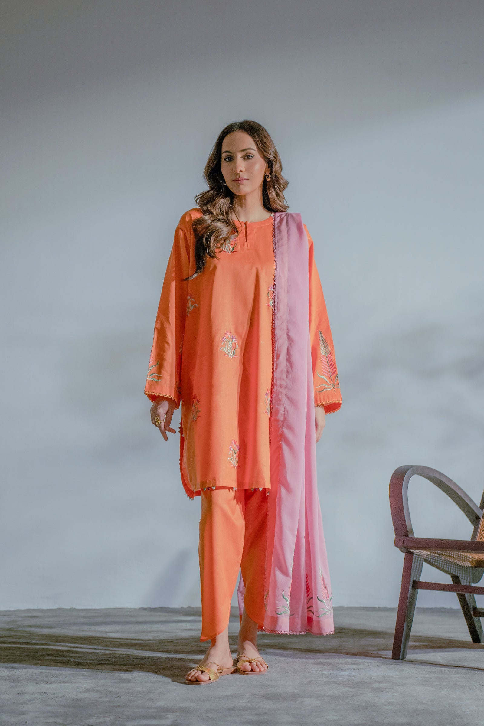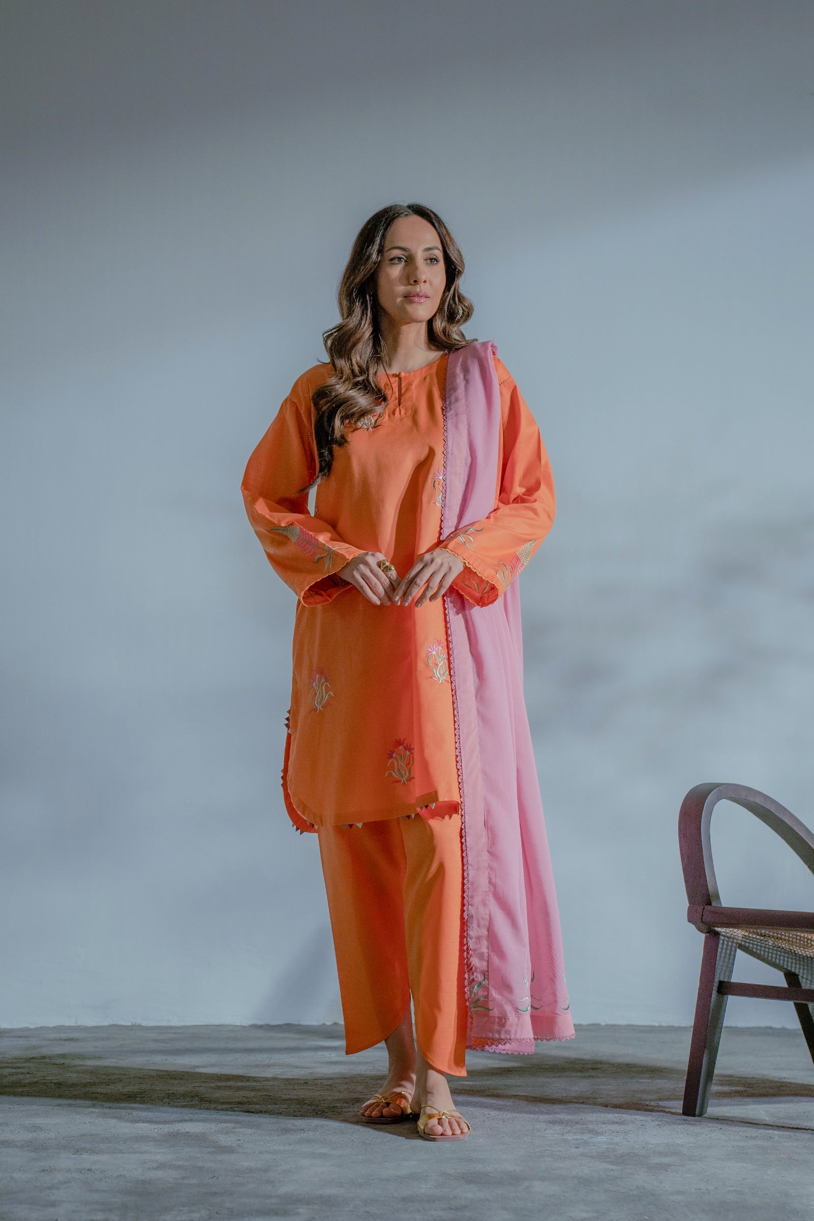 Vibrant orange three-piece outfit adorned with delicate floral embroidery, paired with a contrasting pink dupatta. A breezy, elegant look perfect for daytime charm.