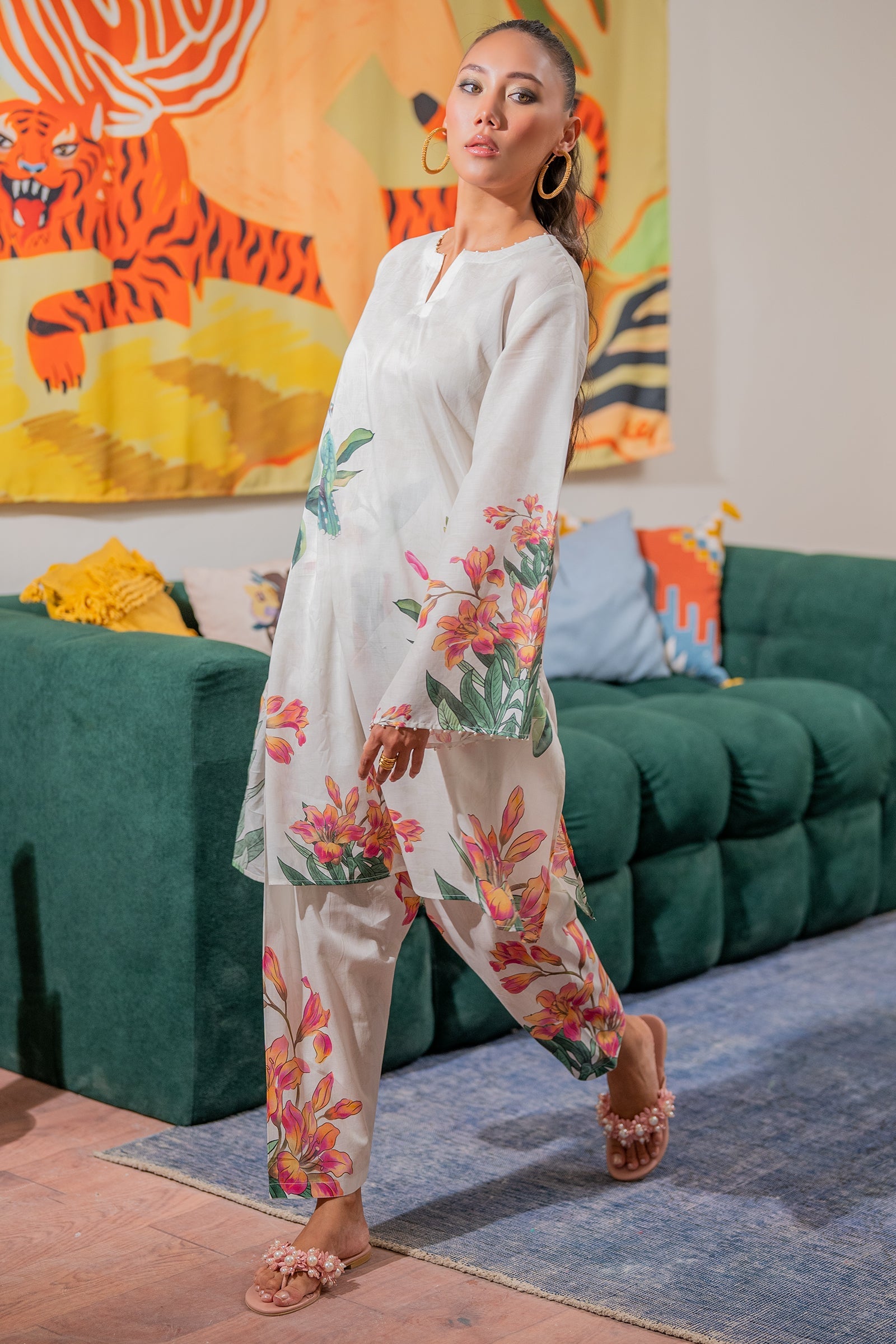 This straight kurta and shalwar is adorned with vibrant botanical and bird prints in shades of pink, green, and orange.