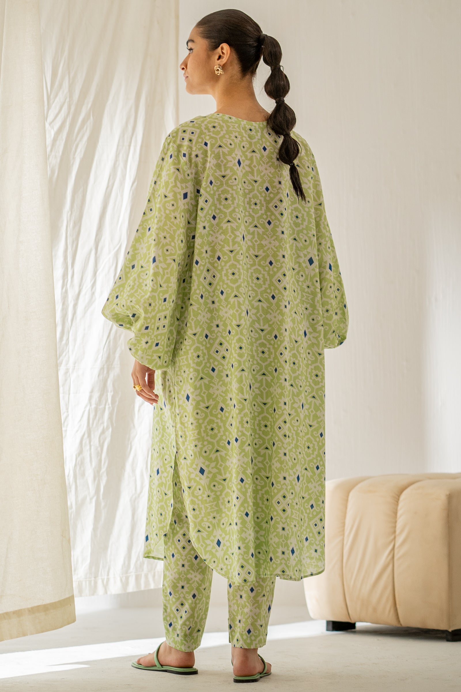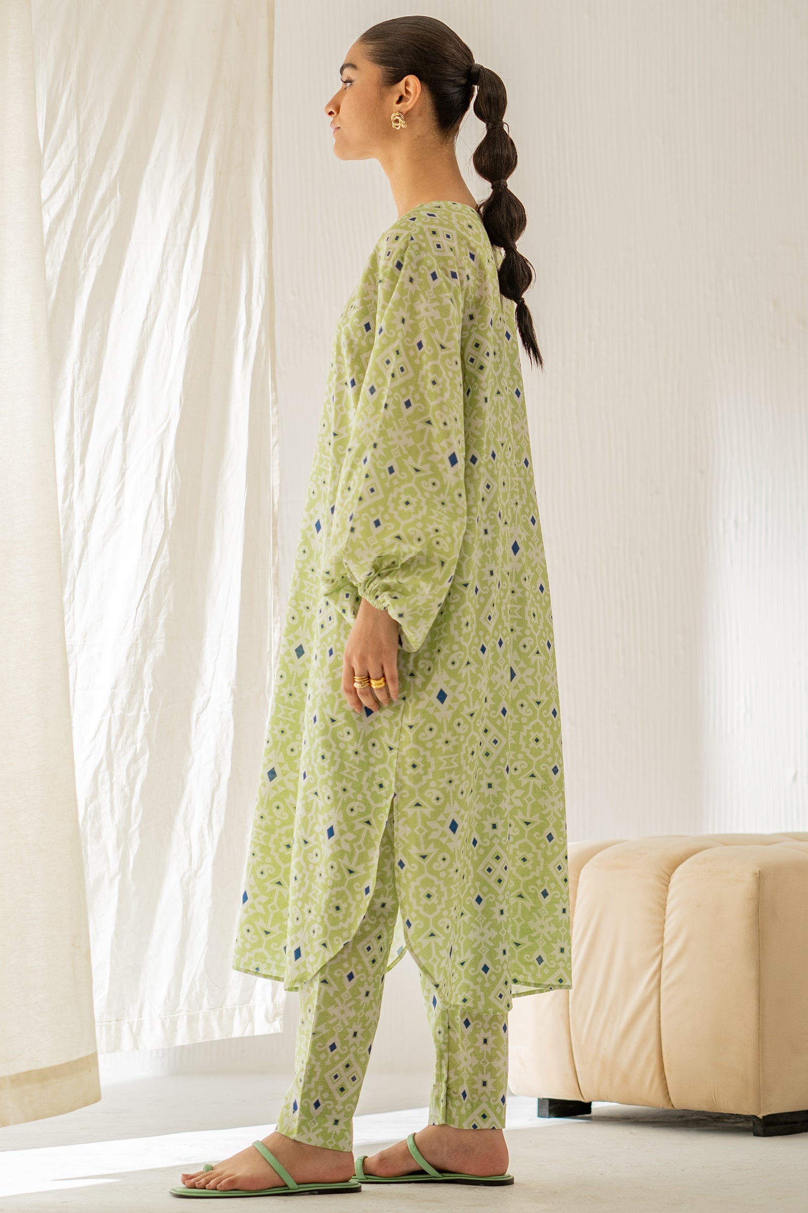 For a stylish fall, consider this green digital kurta with puffed sleeves paired with pants a must-have. Fabric : Cambric Color : Green Embellishment: Digital Print Cut : Straight Cut Length : 45 inches