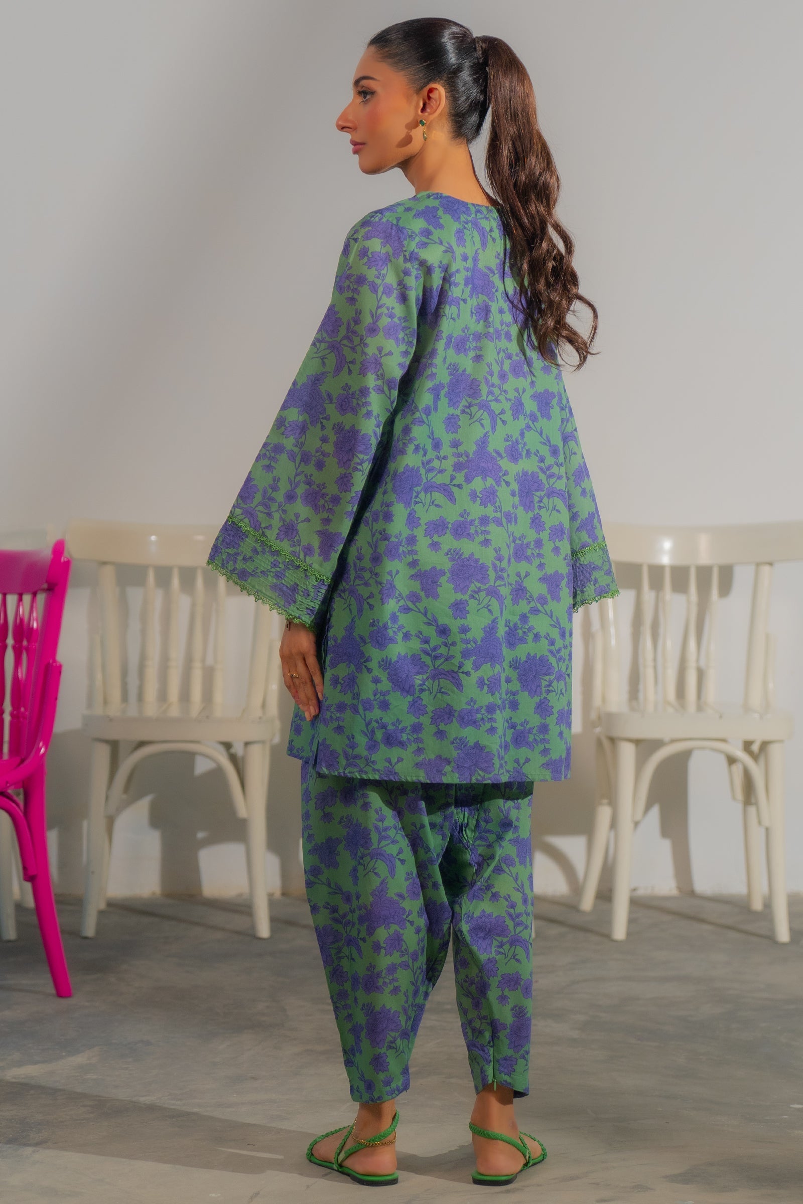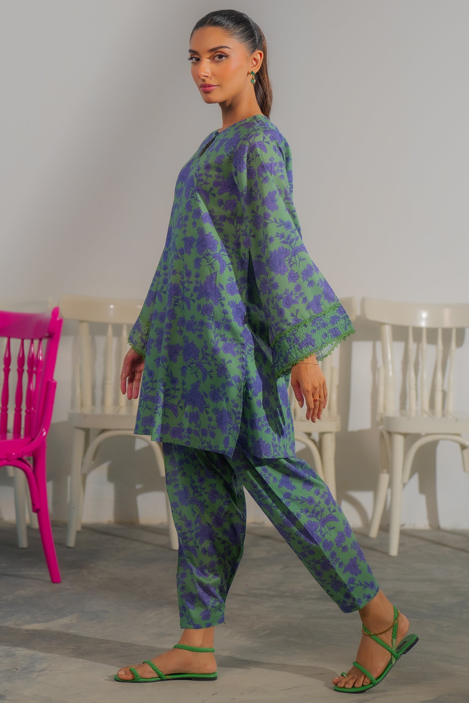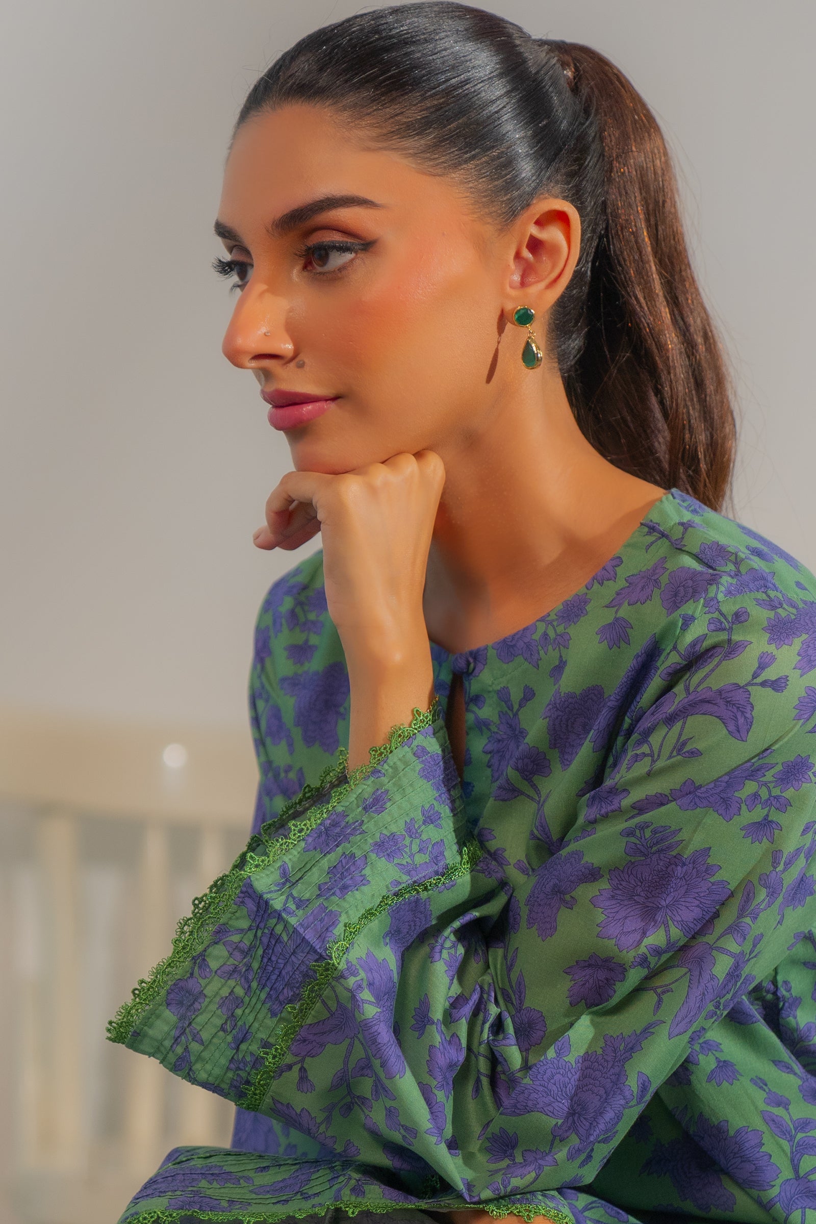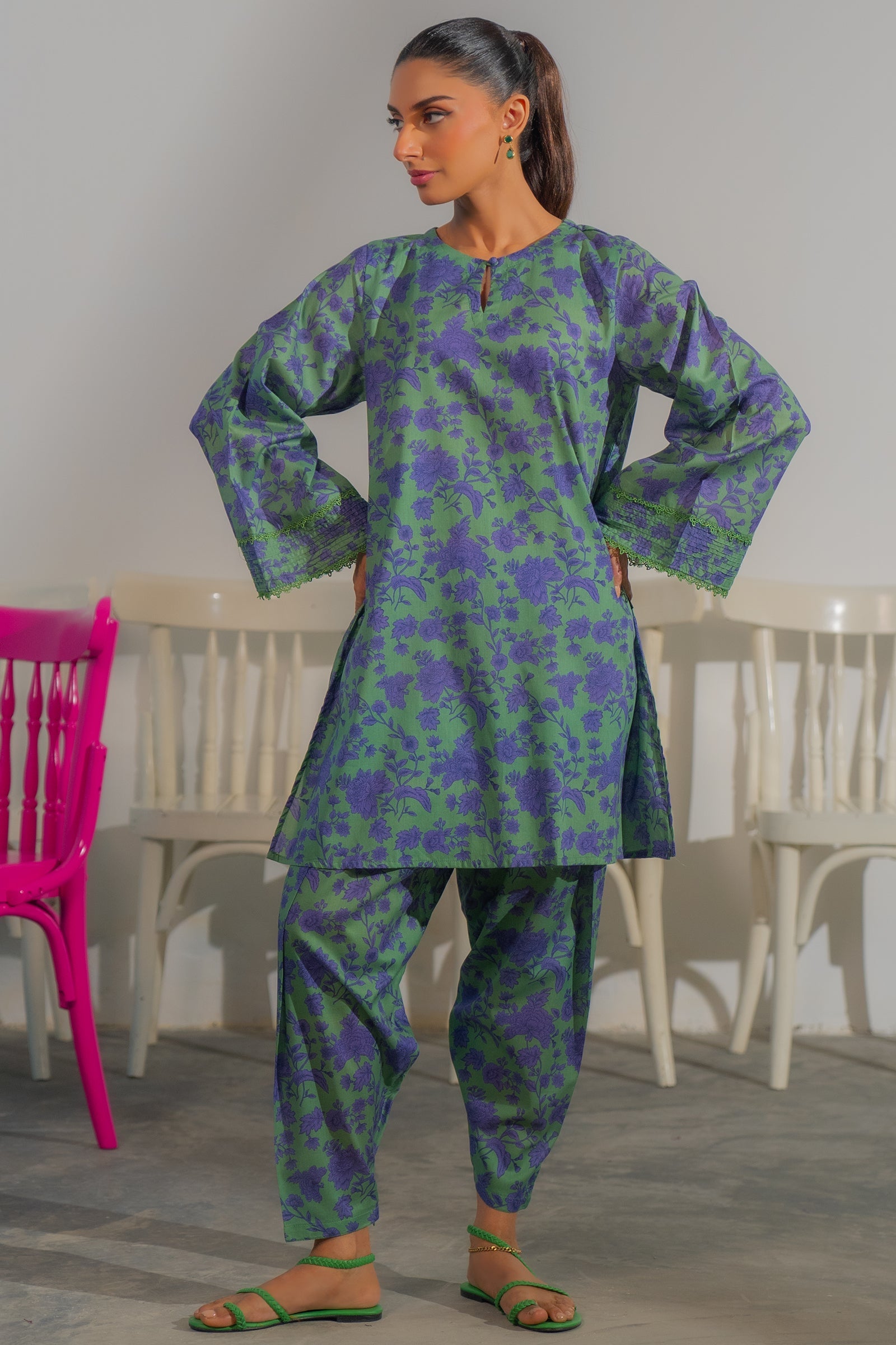 This green kurta, shalwar adds bold vibrancy with its large abstract design in green and blue tones.