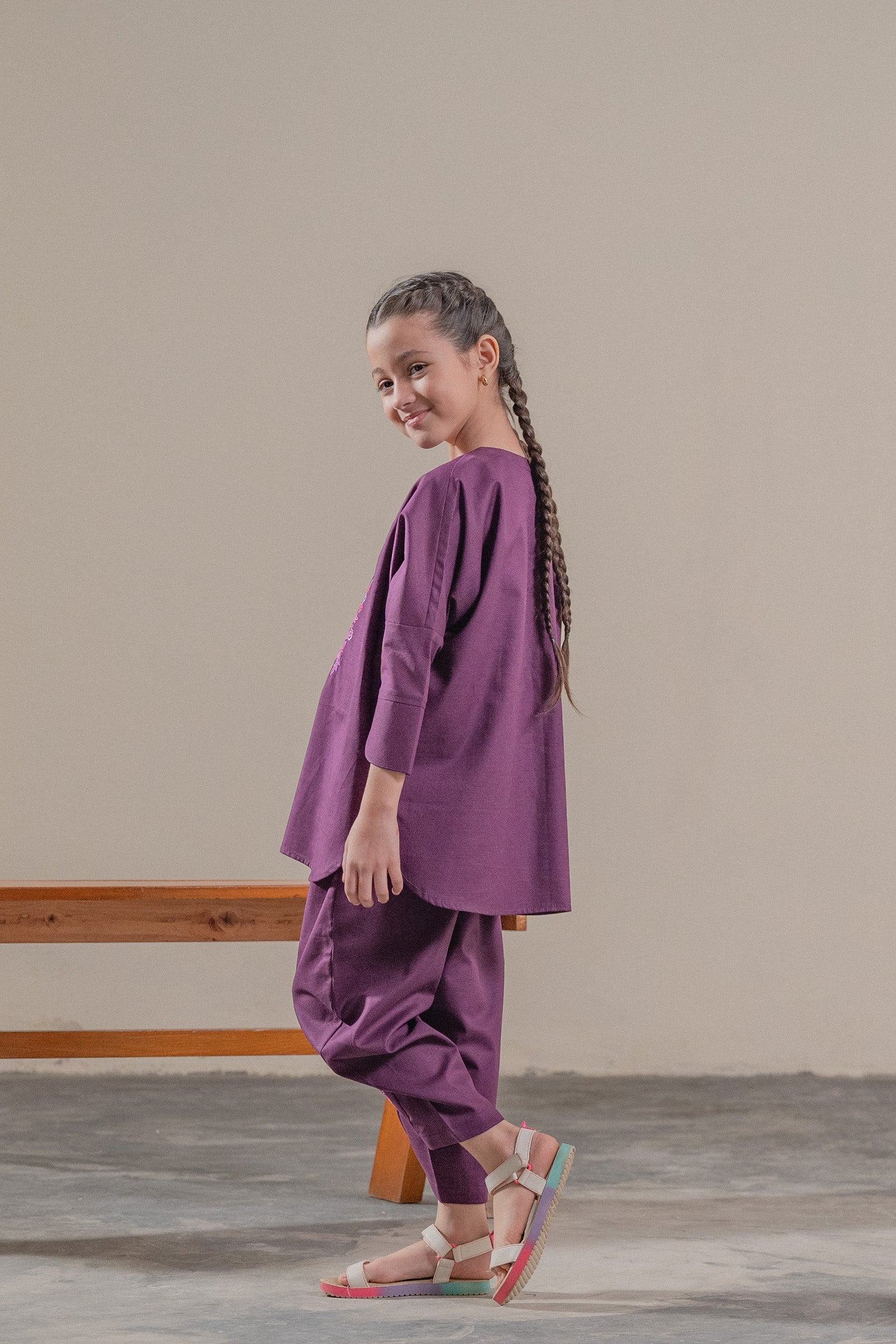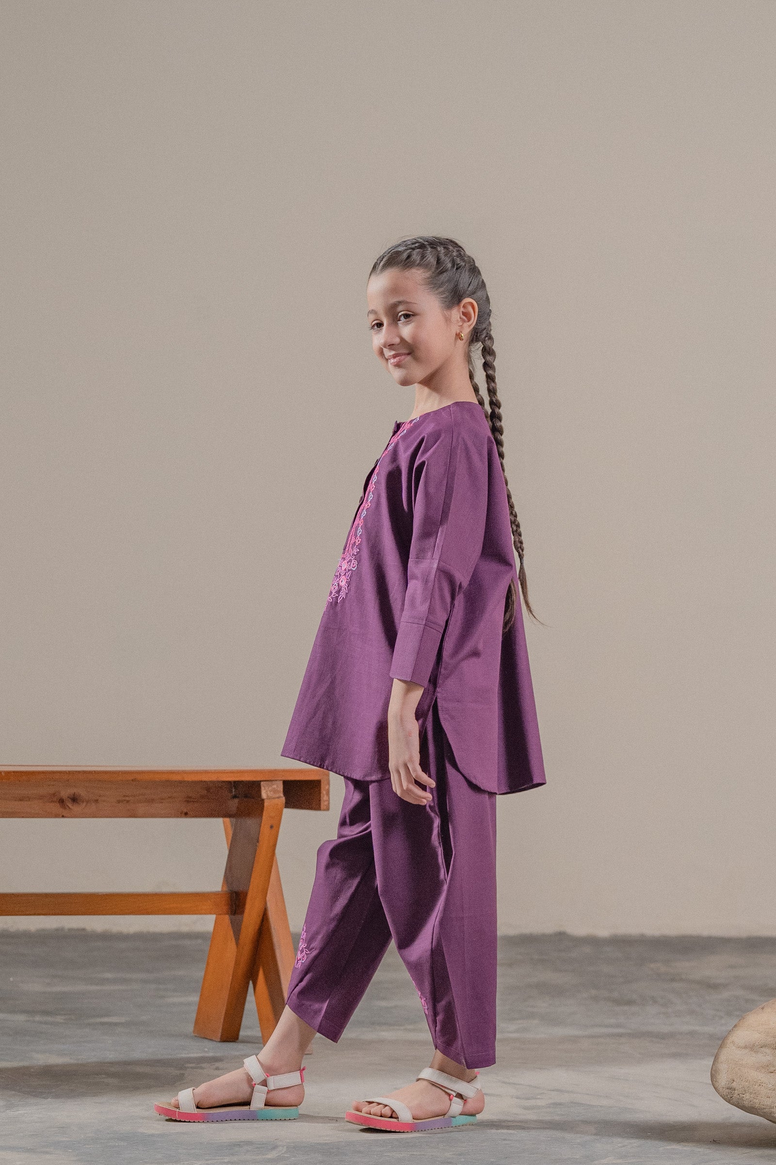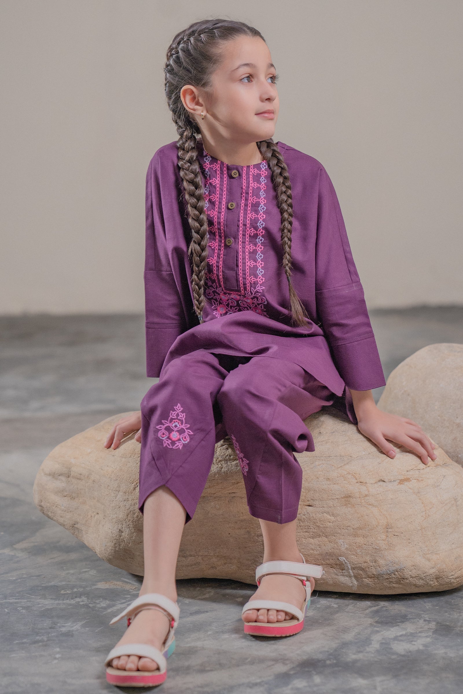 This purple colored embroidered kurta paired with shalwar is comfortable and perfect for an occasion for your little ones.