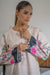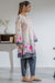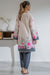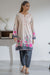 This elegant 2-piece printed kurta soft beige shirt with bold fuchsia and green floral print bordered with a contrasting black base paired with black shalwar