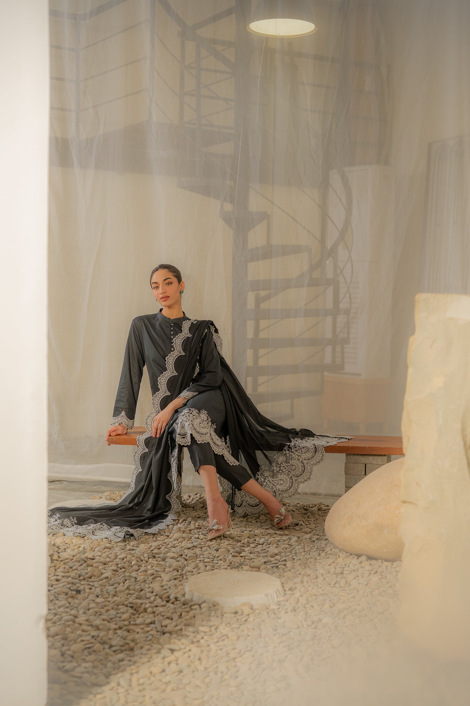 This timeless black kurta with contrast embroidery and an elegant dupatta is add elegance this festive season.