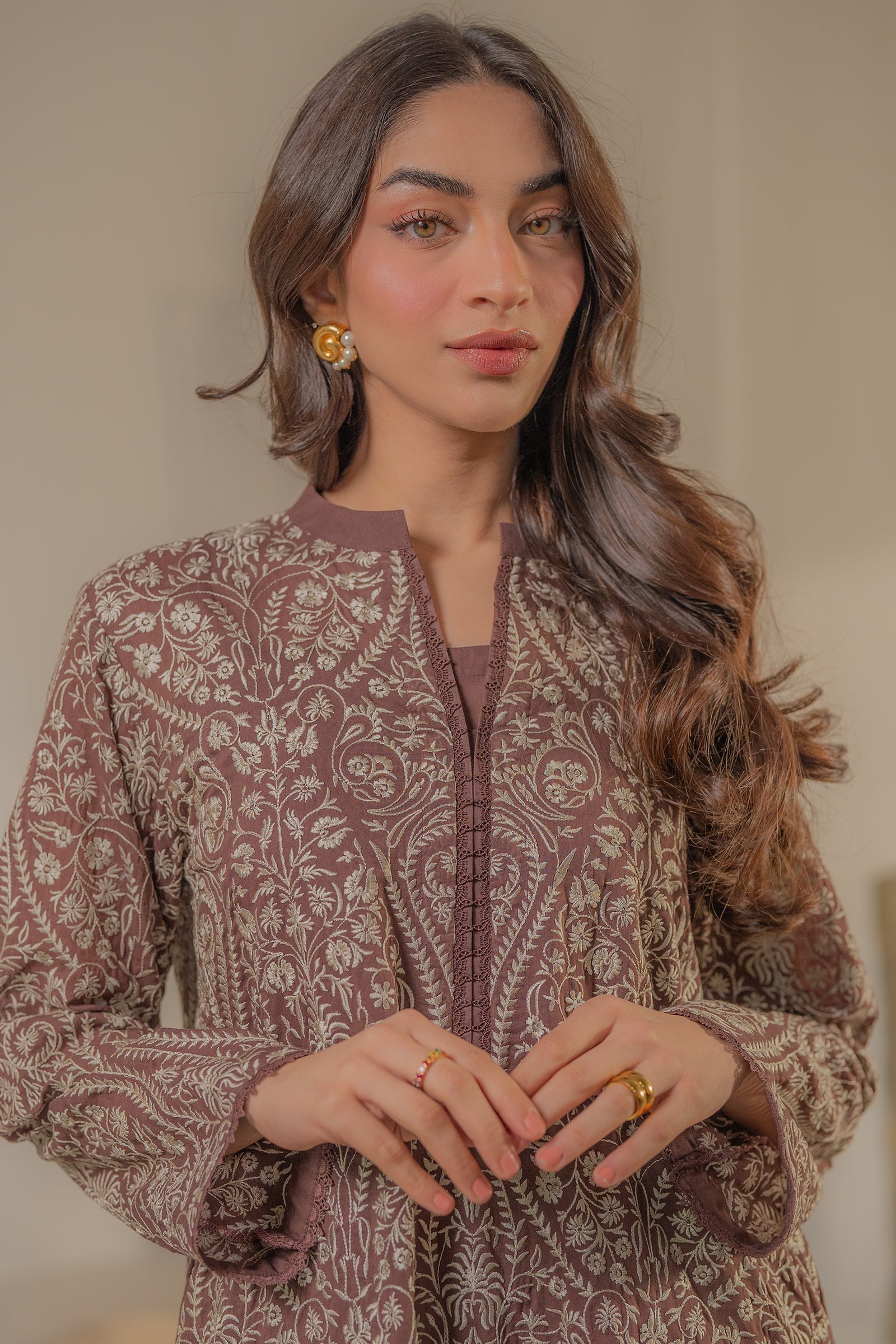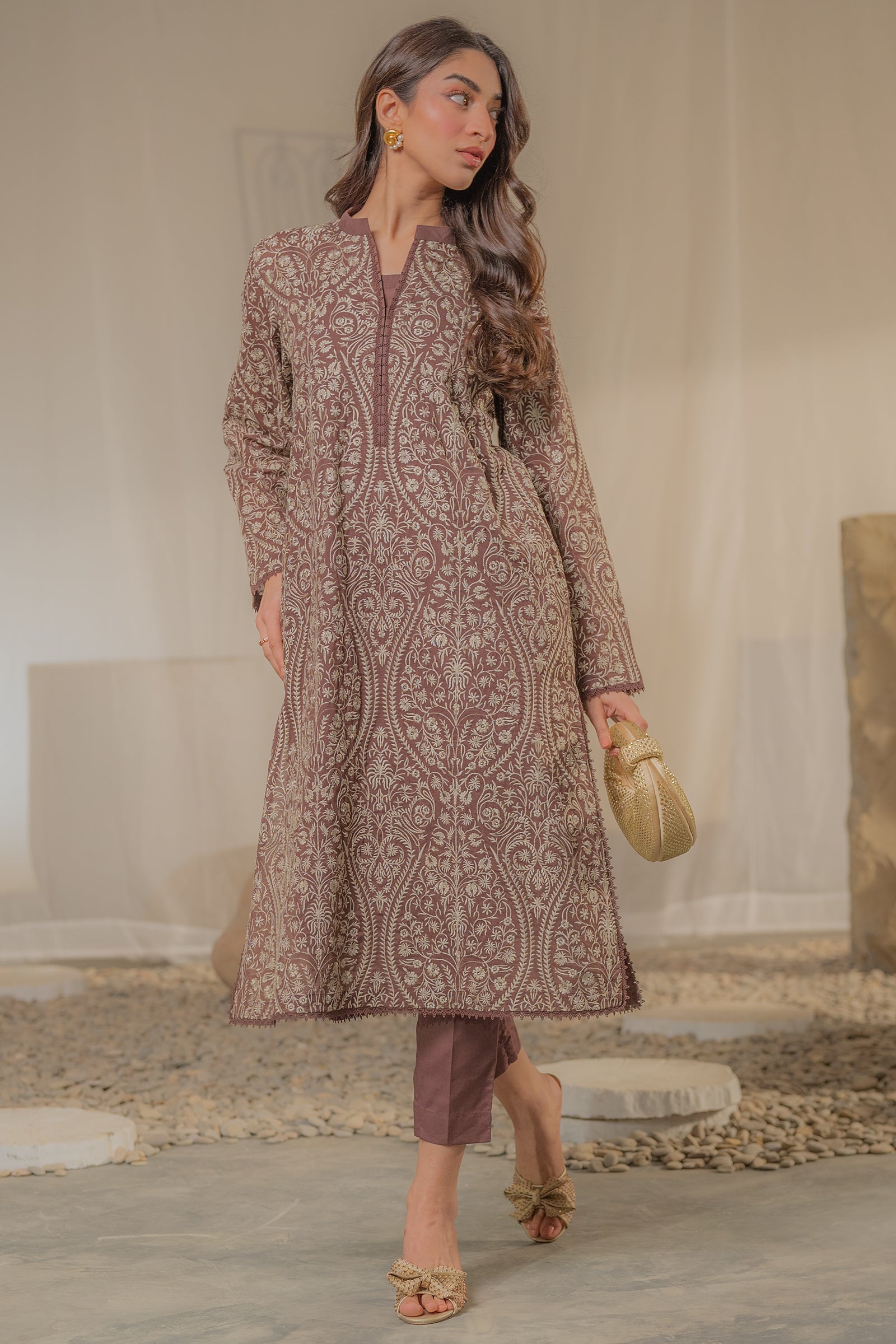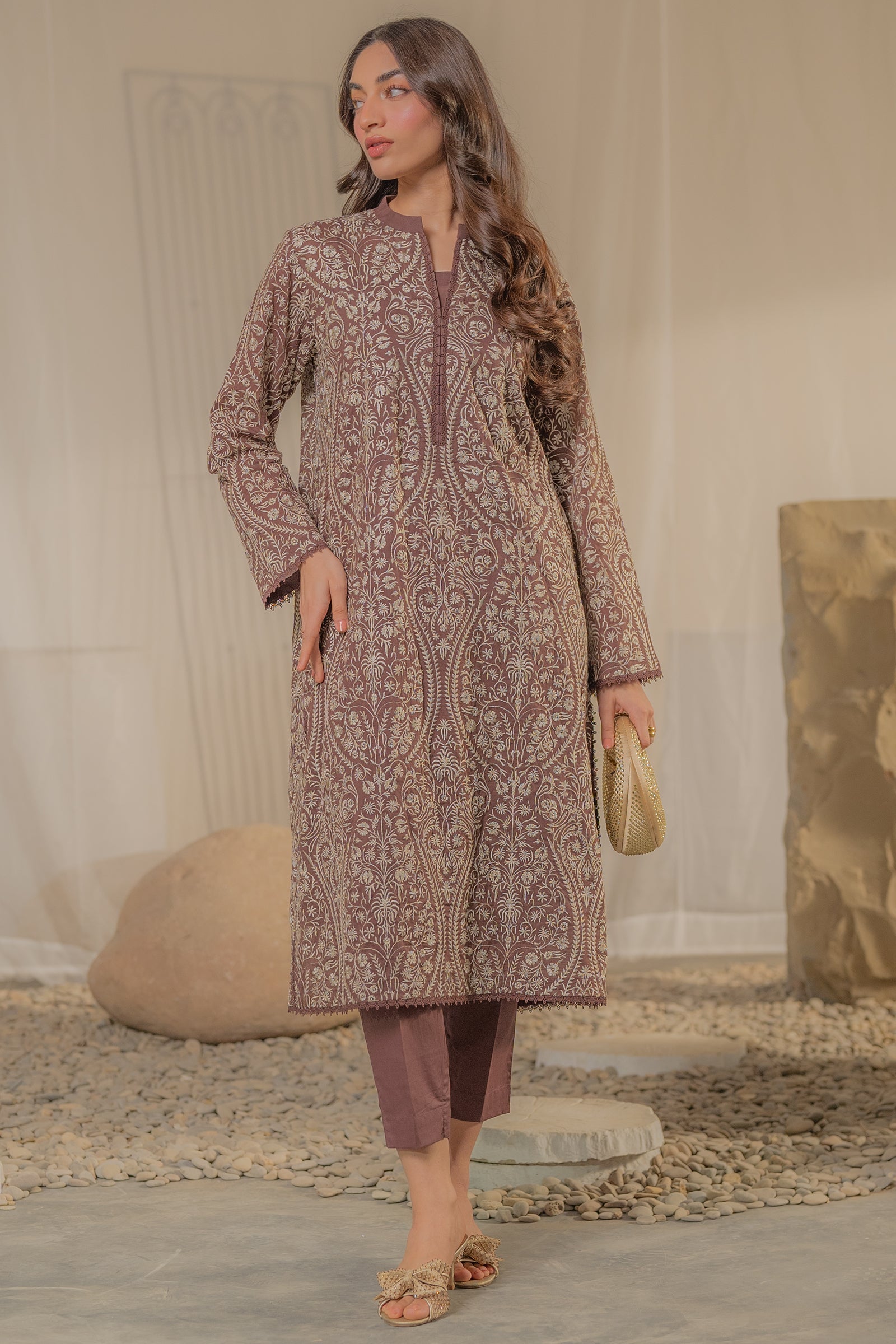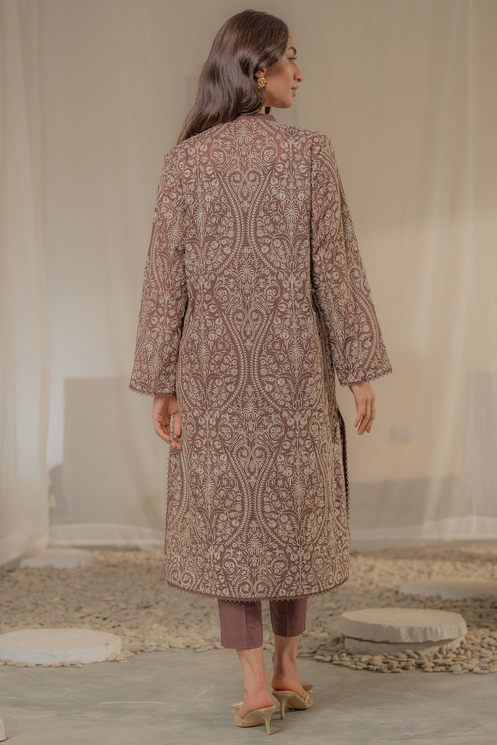 Mauve colored with intricate embroidery, this elegant kurta blends classic patterns with a modern, straight-cut silhouette.