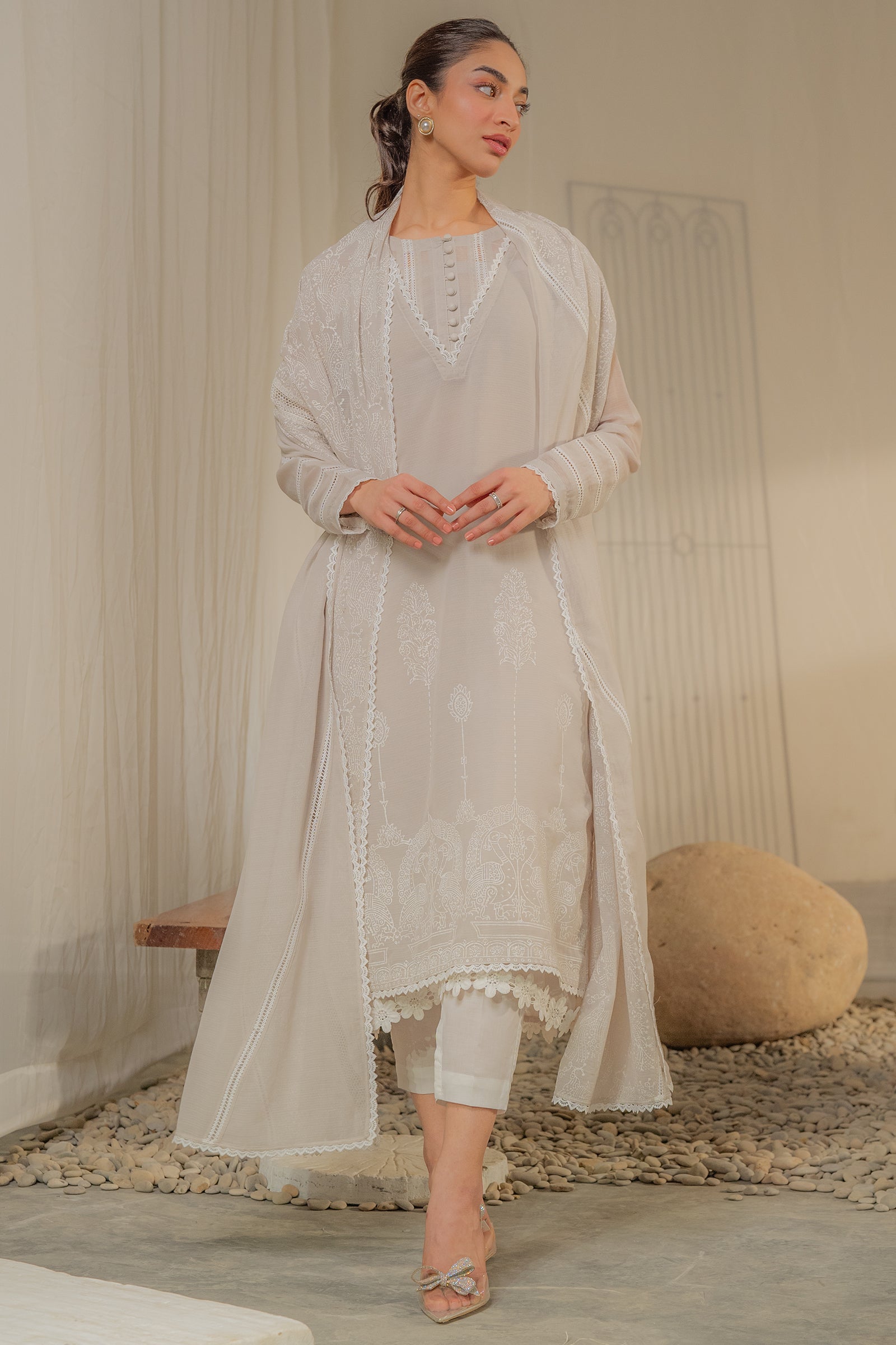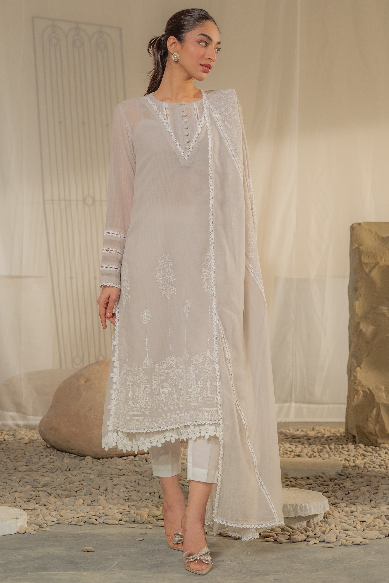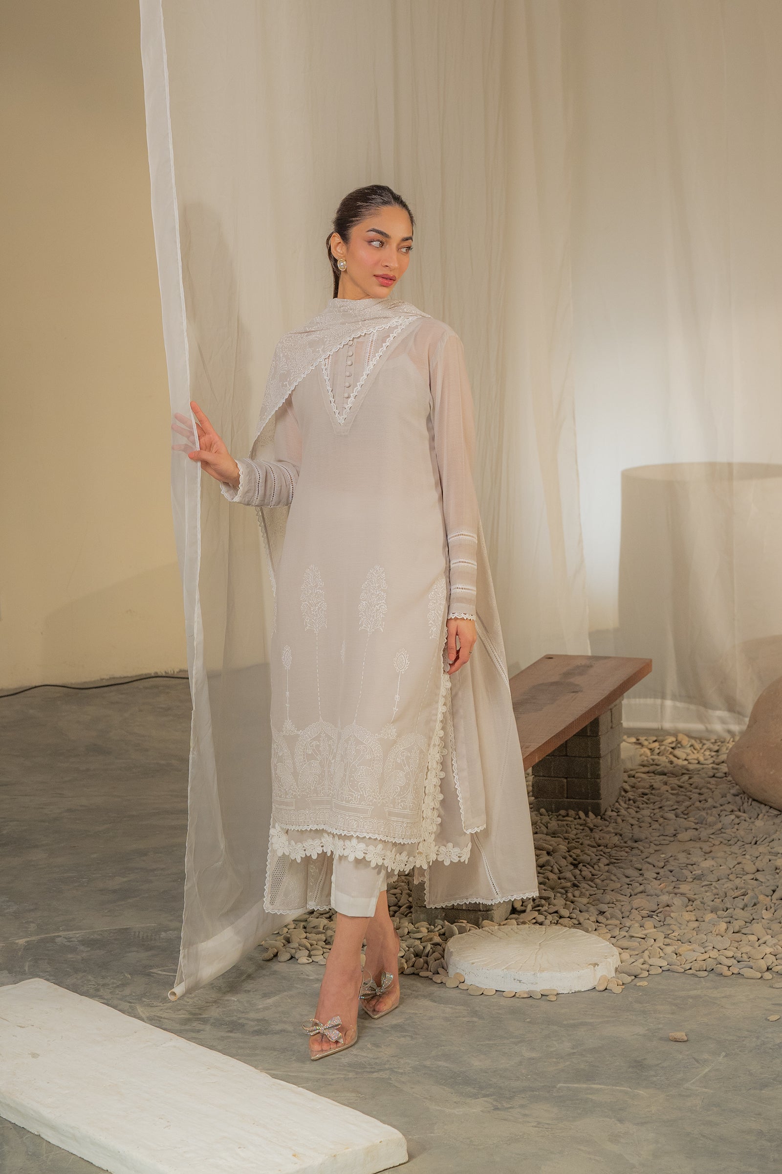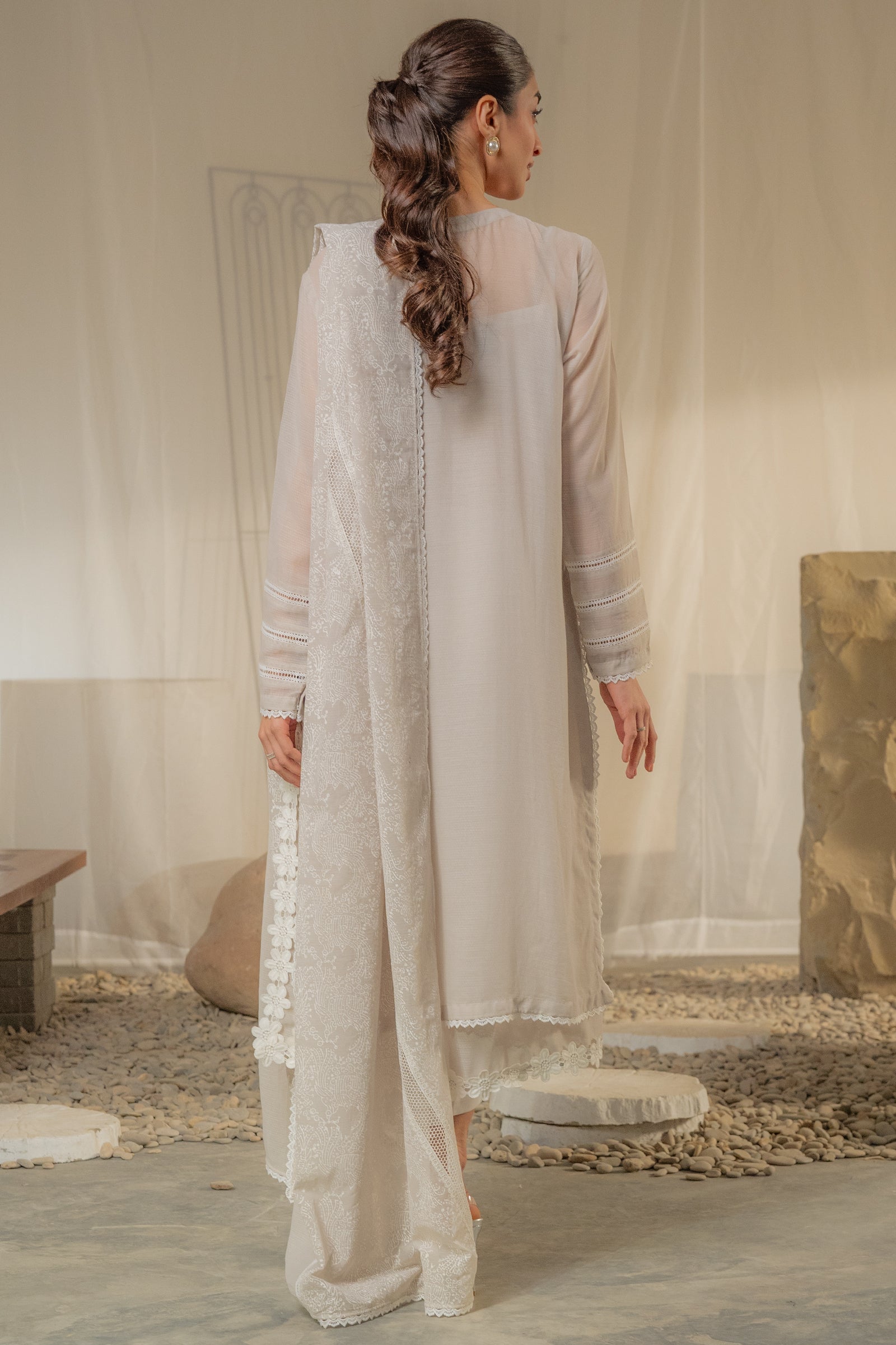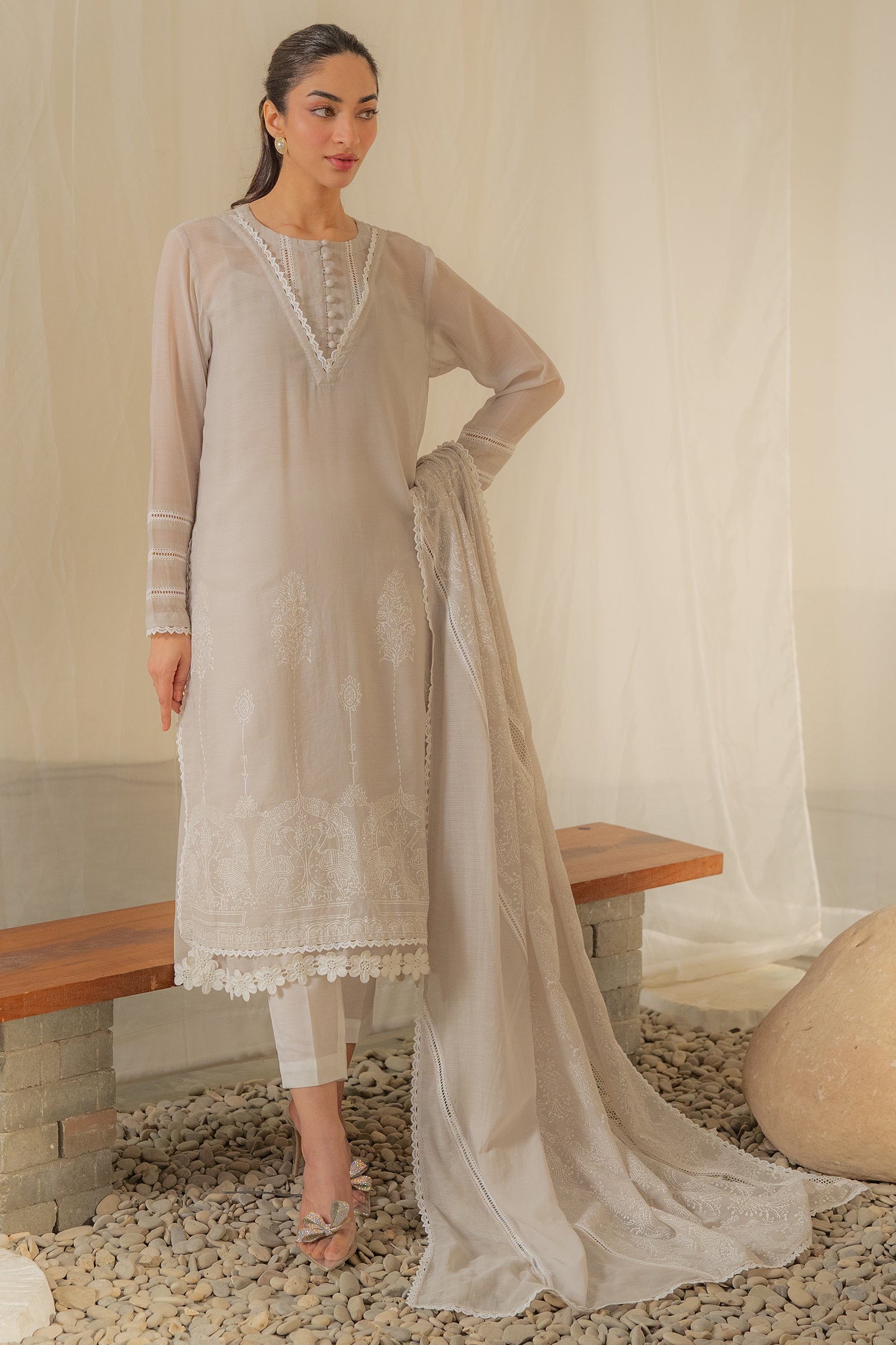 Grey colored embroidered kurta with delicate lace details, paired with a soft, sheer dupatta for an elegant finish. A perfect outfit for this festive season