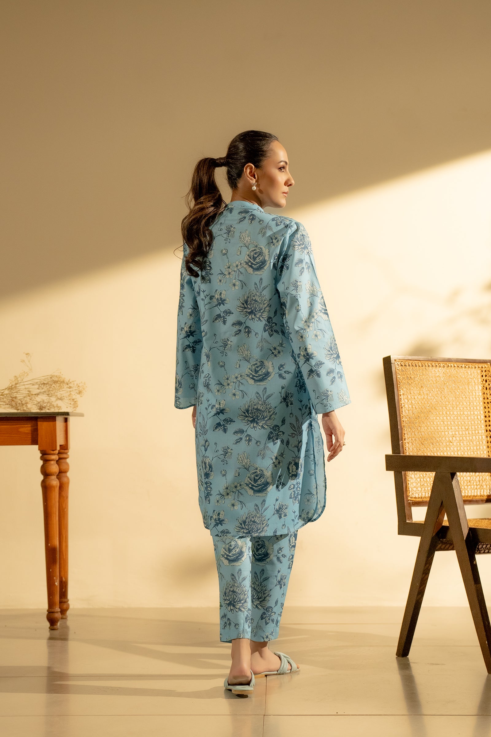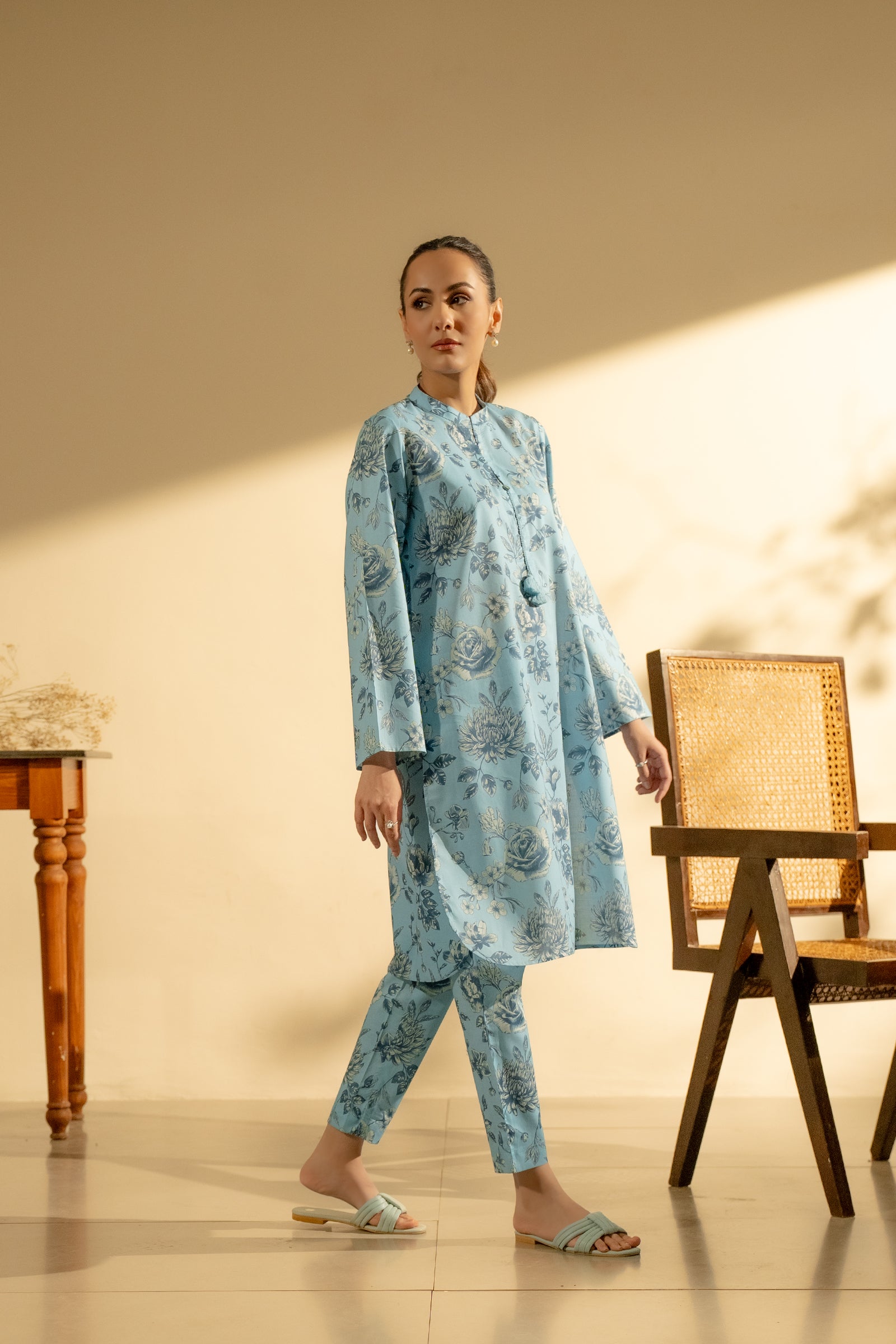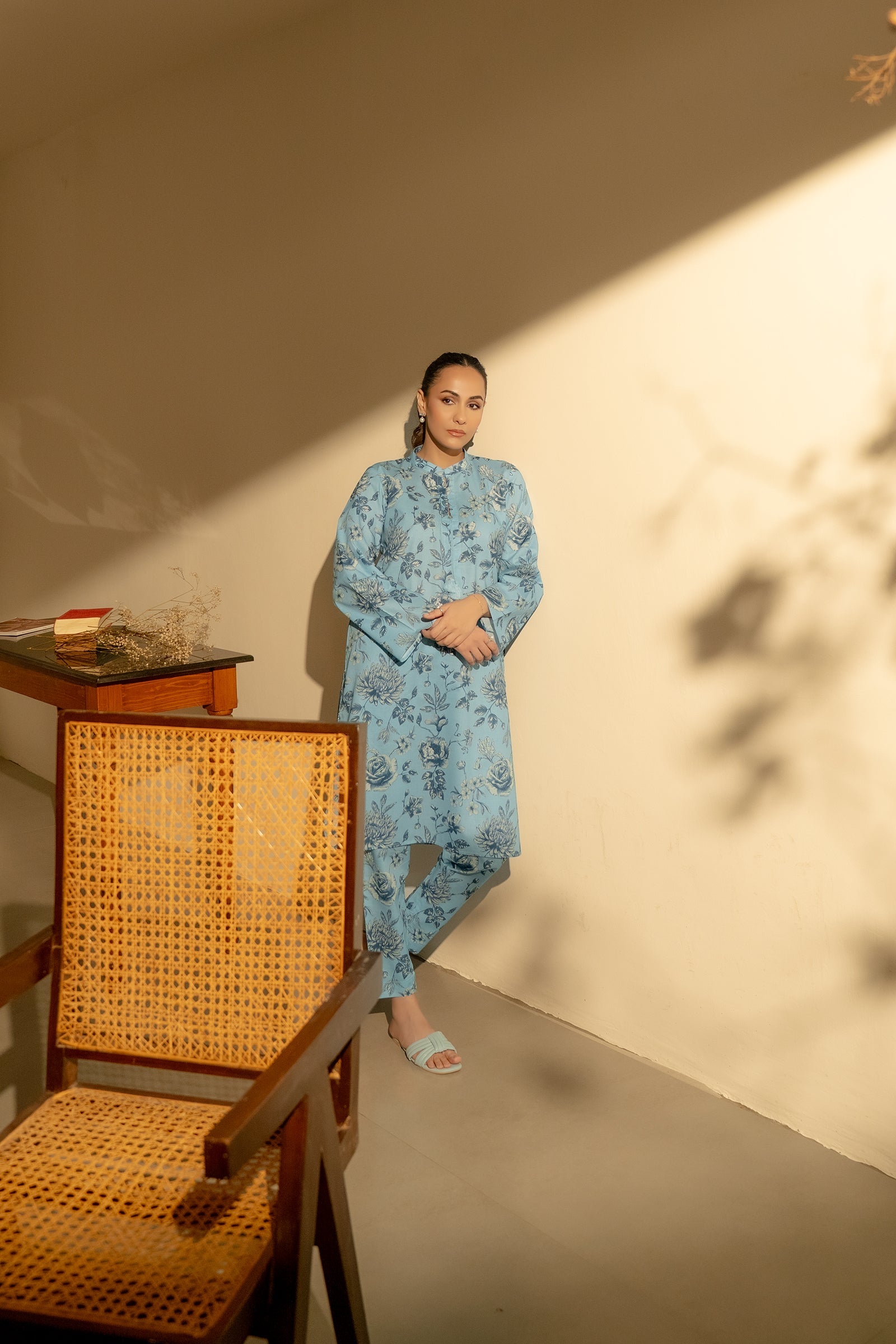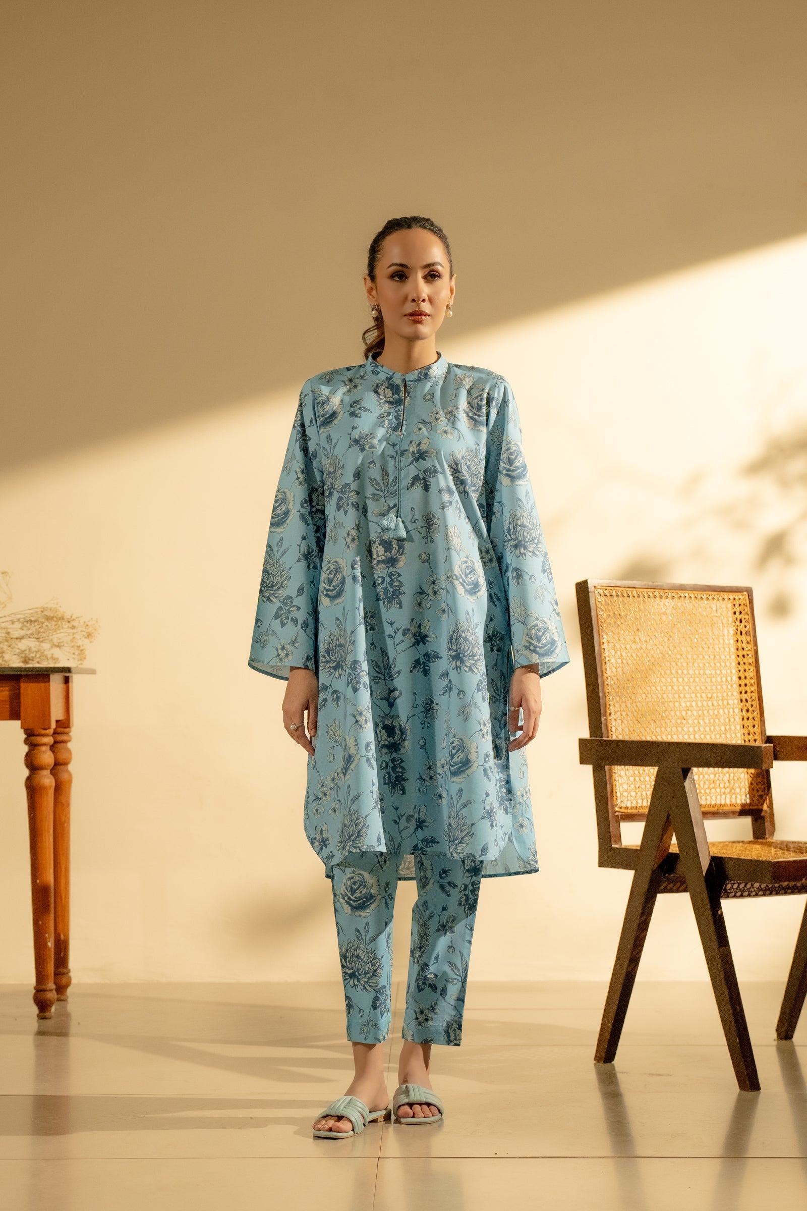 This sky blue kurta and pants with digital print is perfect for everyday in season