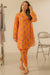 Bright orange two-piece suit featuring a straight kurta with pink floral print and matching tapered trousers, designed for a vibrant and chic casual look