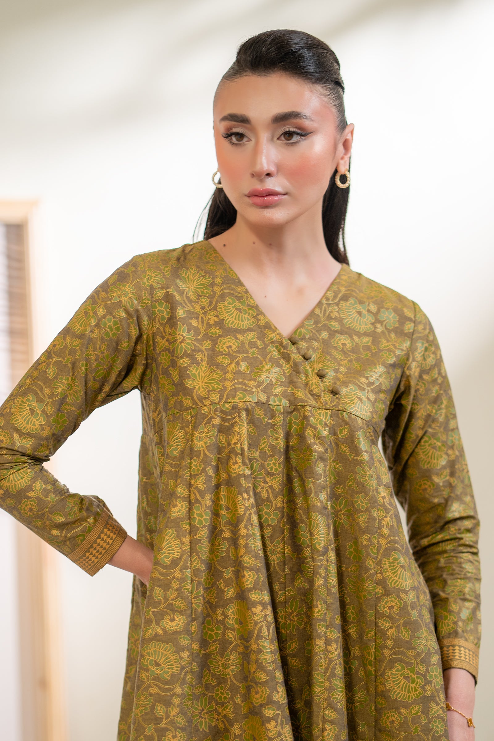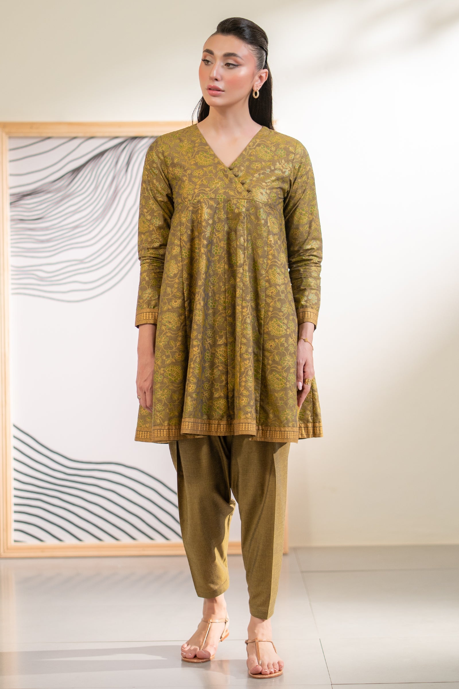 Make a stunning impression with this olive green colored angrakha with hand screen print paired with sleek shalwar
