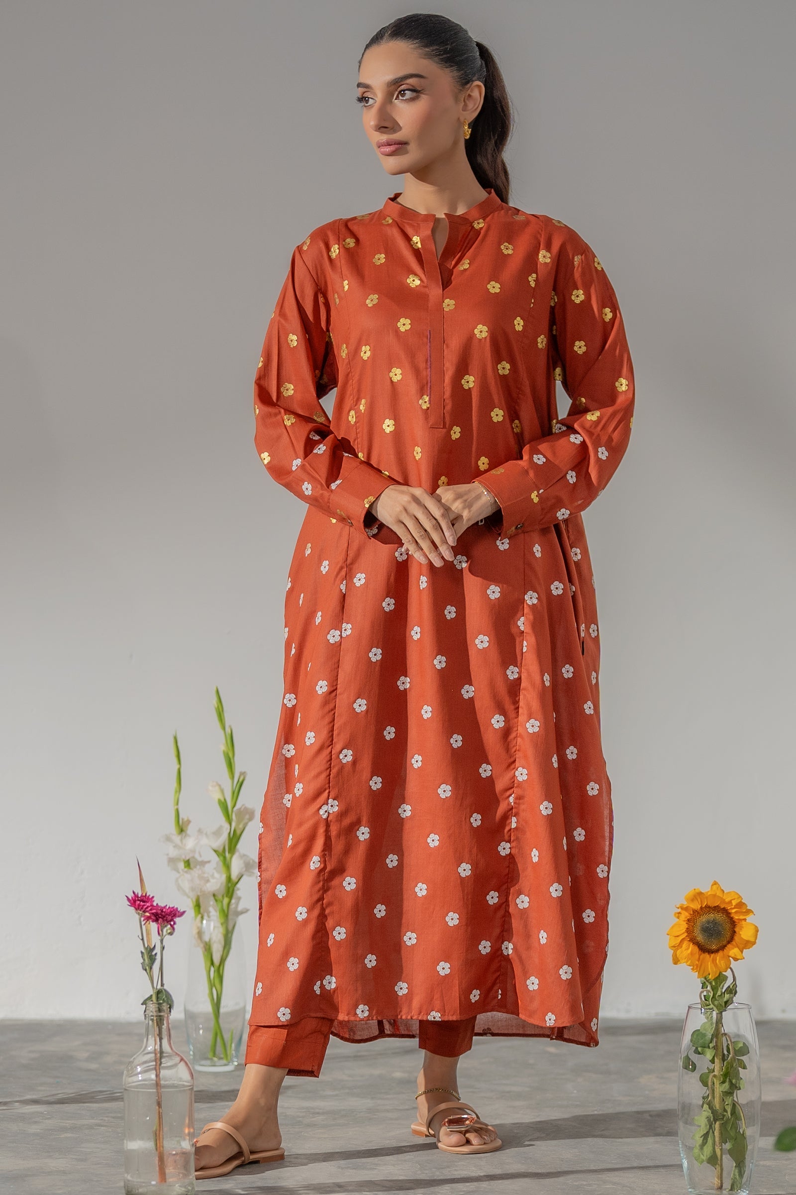 This elegant rust kurta set showcases timeless motifs and a flattering straight cut, paired with matching pants for a refined yet relaxed look