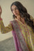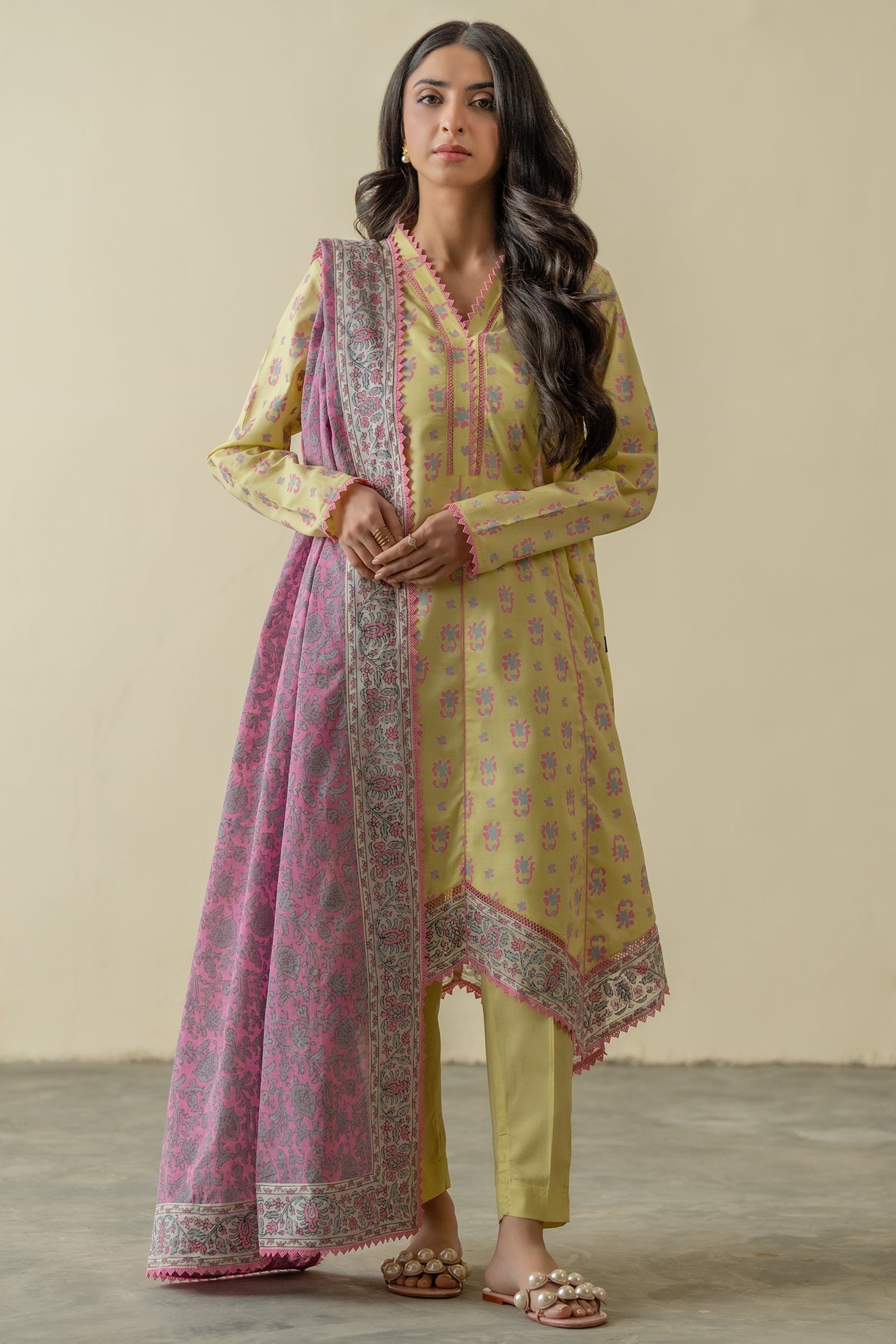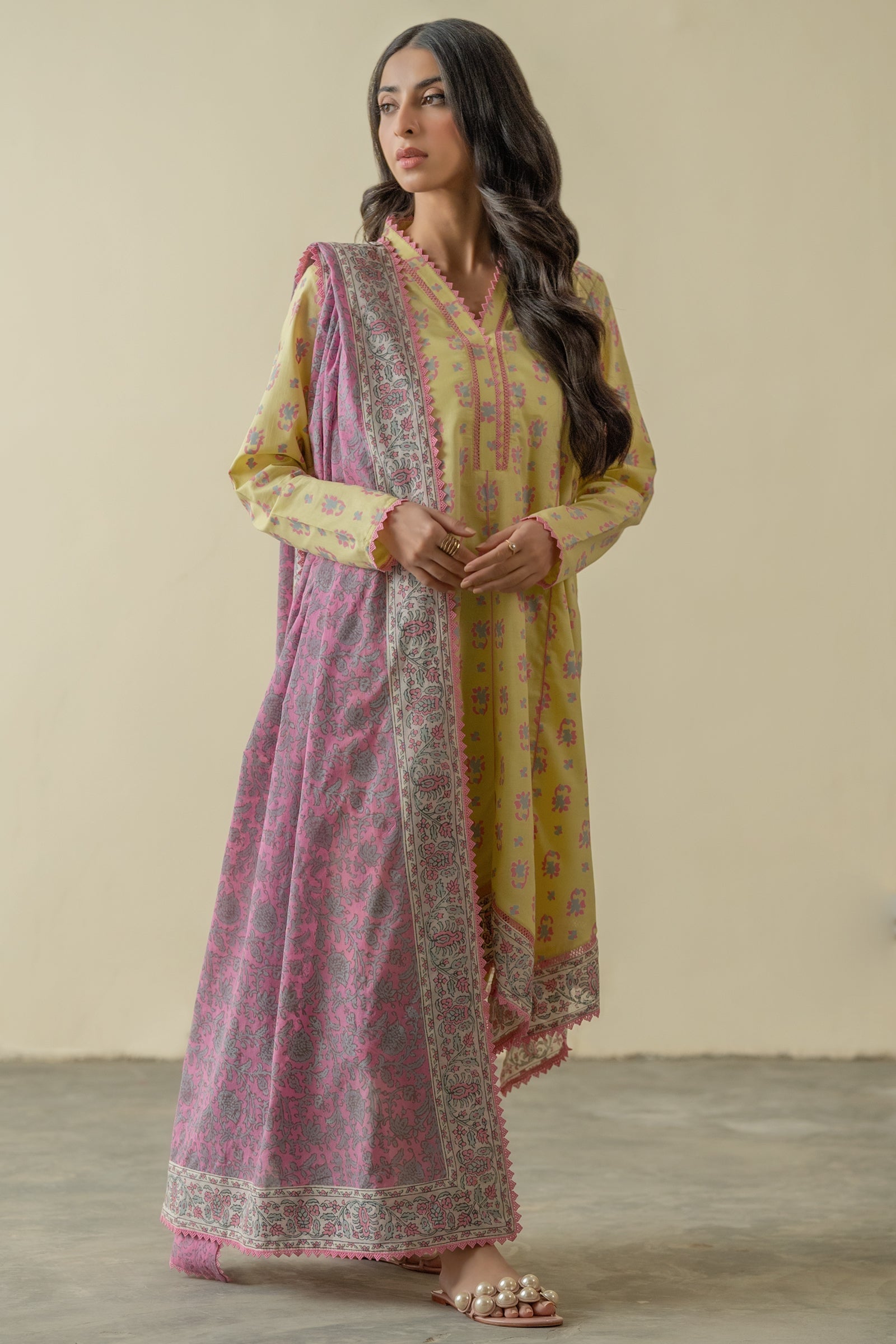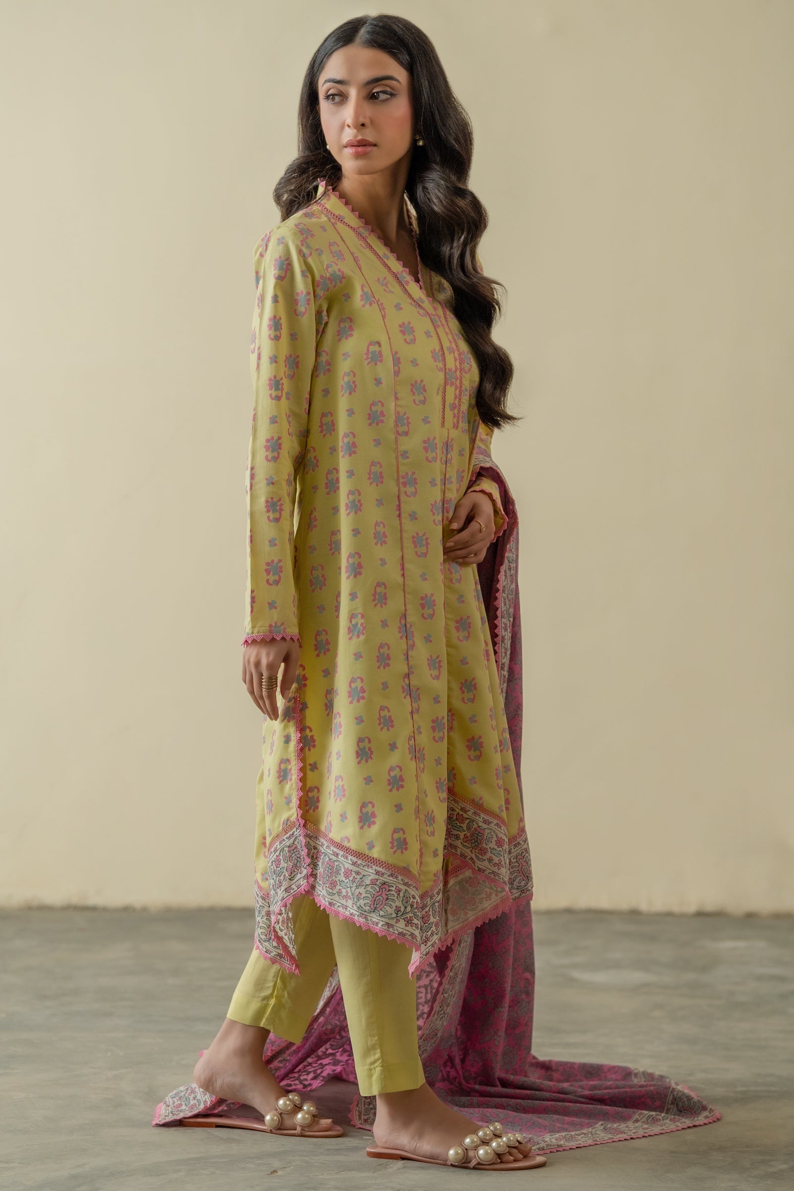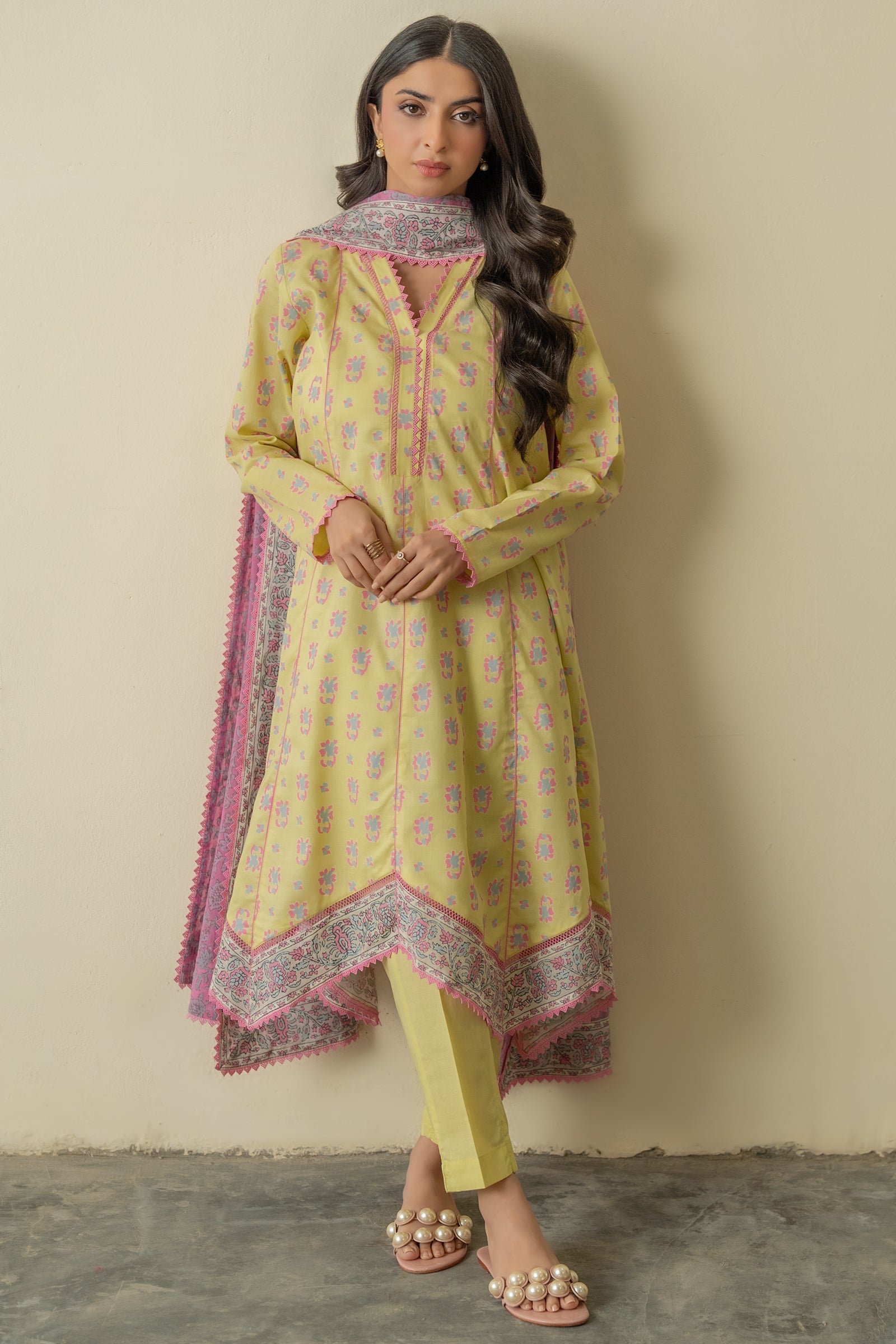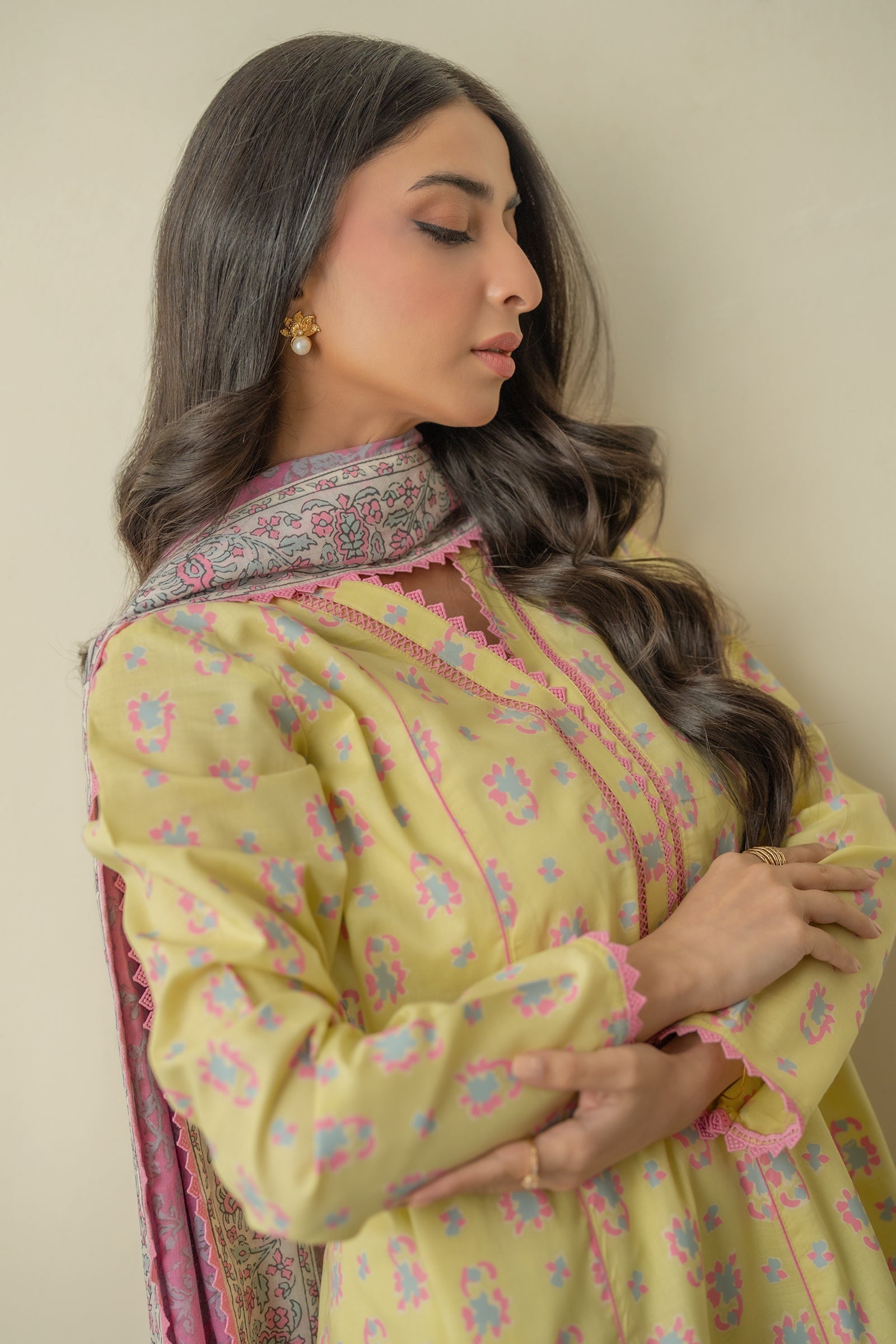 This lemon yellow three-piece ensemble features a flared-cut kurta adorned with delicate pastel florals and intricate lace detailing along the neckline, sleeves, and hem for a refined finish.